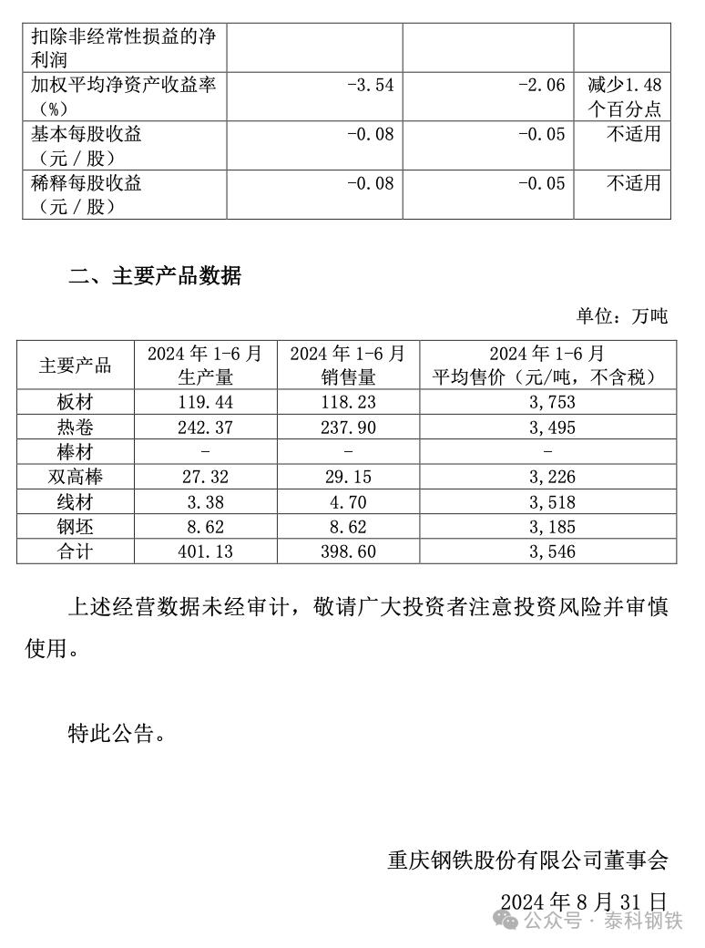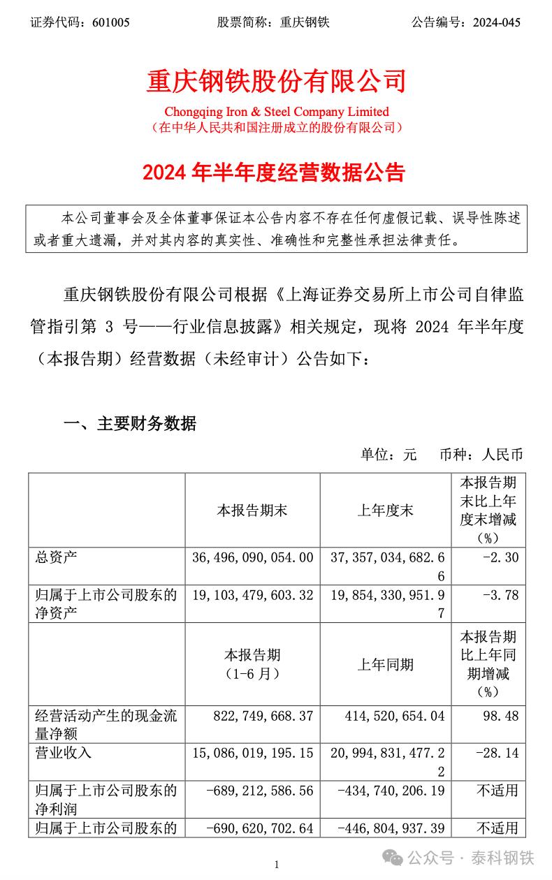 重慶鋼鐵8月30日公告披露,公司上半年?duì)I收150.86億元,和上年同期相比(同比)減少28.14%;歸屬于上市公司股東的凈利潤(rùn)為-6.89億元,上年同期則虧損4.35億元;基本每股收益為-0.08元/股。報(bào)告稱(chēng),2024年上半年,鋼價(jià)及原料價(jià)格均偏弱運(yùn)行,國(guó)內(nèi)鋼鐵消費(fèi)持續(xù)下降,生產(chǎn)經(jīng)營(yíng)形勢(shì)嚴(yán)峻。下半年,公司堅(jiān)持“四化”發(fā)展方向和“四有”經(jīng)營(yíng)原則,全力抓好經(jīng)營(yíng)現(xiàn)金流管控和價(jià)值創(chuàng)造,積極應(yīng)對(duì)鋼鐵行業(yè)長(zhǎng)周期下行風(fēng)險(xiǎn),大力推進(jìn)挖潛降本,探索最佳生產(chǎn)經(jīng)營(yíng)體制。持續(xù)降低采購(gòu)成本,推進(jìn)極致能效綠色發(fā)展;追求極致效率,深化科技創(chuàng)新,提升產(chǎn)品核心競(jìng)爭(zhēng)力;優(yōu)化品種結(jié)構(gòu),產(chǎn)銷(xiāo)研一體化推進(jìn),提高市占及盈利能力。