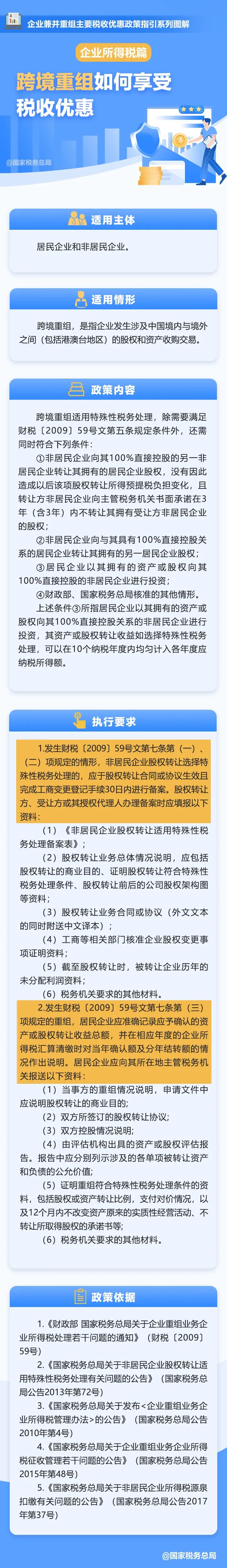 為引導(dǎo)企業(yè)正確適用兼并重組稅收政策,財(cái)政部、稅務(wù)總局等部門編寫了《企業(yè)兼并重組主要稅收優(yōu)惠政策指引》,對現(xiàn)行有效的支持企業(yè)兼并重組主要稅收優(yōu)惠政策和稅收征管文件進(jìn)行了梳理,并按照企業(yè)兼并重組的類型,分門別類明確了適用主體、適用情形、政策內(nèi)容、執(zhí)行要求及政策依據(jù)等內(nèi)容,為納稅人提供簡明易行、獲得感強(qiáng)的操作指南。今天學(xué)習(xí):企業(yè)兼并重組企業(yè)所得稅優(yōu)惠政策——跨境重組如何享受稅收優(yōu)惠?