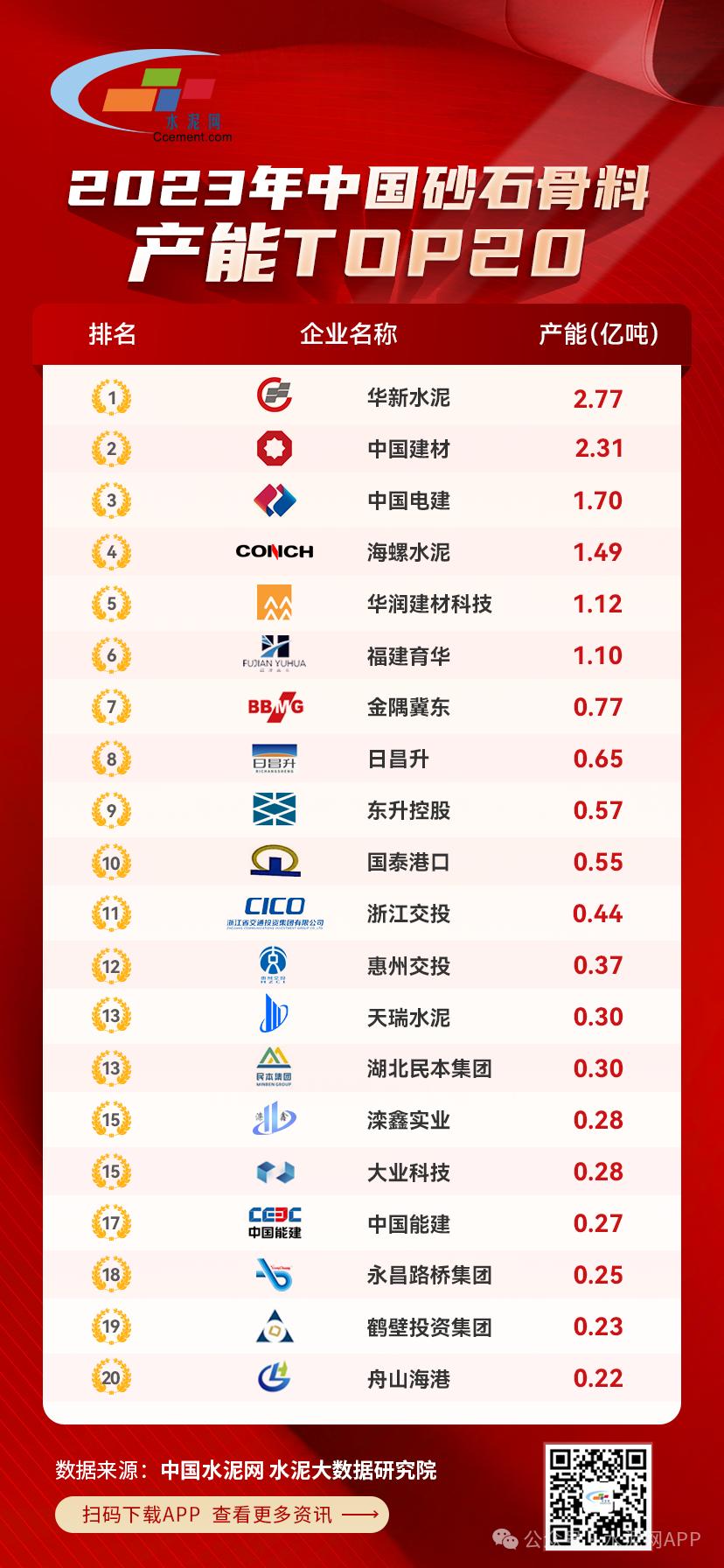 據(jù)中國(guó)水泥網(wǎng)4月發(fā)布的2023年中國(guó)砂石骨料TOP20產(chǎn)能排行榜顯示,2023年華新水泥砂石骨料產(chǎn)能2.77億噸,位居榜首。