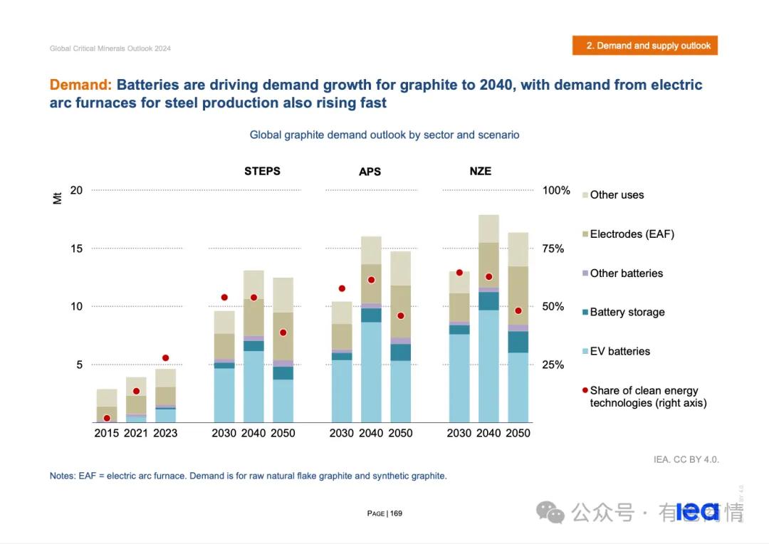 需求增長和驅(qū)動因素需求增長:2023年,石墨消費(fèi)量增長了11%,達(dá)到460萬噸,其中電池相關(guān)需求增長了40%,達(dá)到150萬噸。未來預(yù)測:在凈零排放(NZE)情景下,石墨需求到2040年幾乎增加四倍。