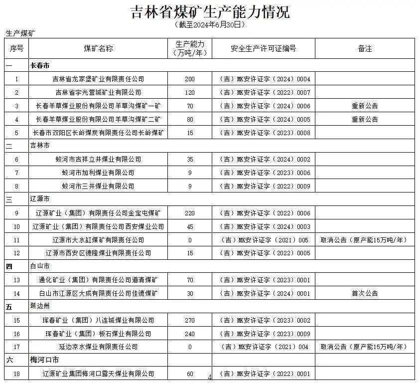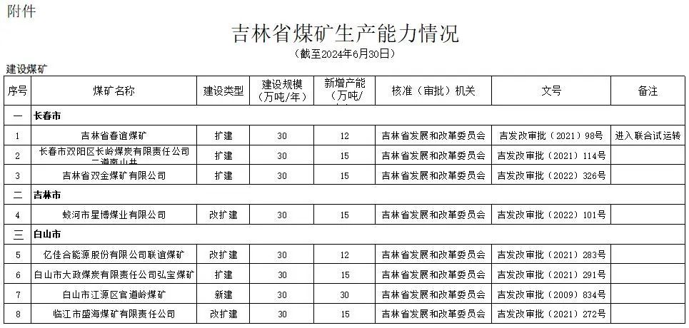 吉林省能源局關(guān)于2024年上半年煤礦產(chǎn)能情況的通告