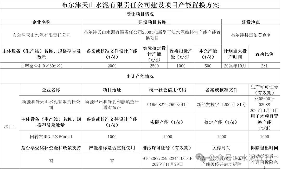用于該項(xiàng)目置換產(chǎn)能為新疆和靜天山水泥有限責(zé)任公司回轉(zhuǎn)窯Φ3.2×50m×1,產(chǎn)能規(guī)模為1000t/d,將在公告生效之日起,該條生產(chǎn)線關(guān)停并啟動(dòng)拆除。