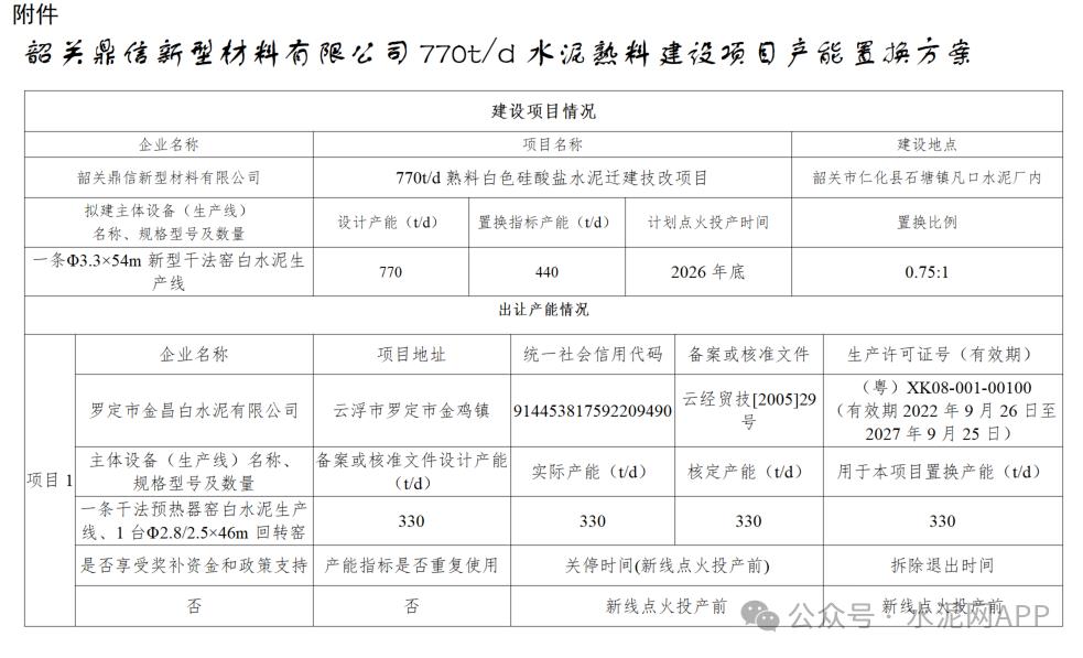 置換方案顯示,韶關(guān)鼎信新型材料有限公司將遷建770t/d熟料白色硅酸鹽水泥技改項(xiàng)目,計(jì)劃2026年底點(diǎn)火投產(chǎn)。