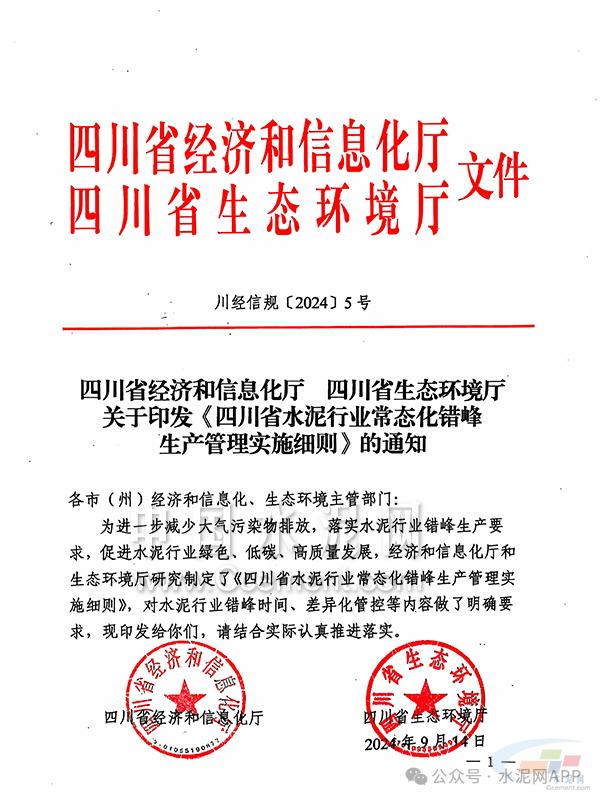 9月14日,四川省經(jīng)濟和信息化廳 四川省生態(tài)環(huán)境廳印發(fā)《四川省水泥行業(yè)常態(tài)化錯峰生產(chǎn)管理實施細則》(簡稱:《細則》)。