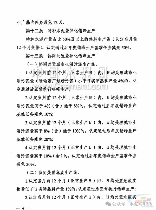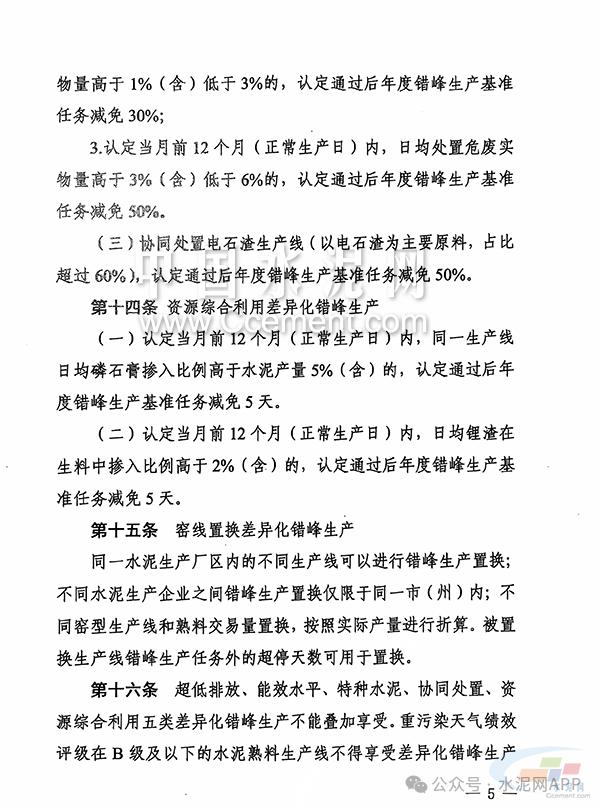 《細則》指出,有全年協(xié)同處置城市生活垃圾及有毒有害廢棄物等任務的生產(chǎn)線可以不進行錯峰生產(chǎn),但要適當降4低水泥生產(chǎn)負荷。 《細則》提到,同一水泥生產(chǎn)廠區(qū)內(nèi)的不同生產(chǎn)線可以進行錯峰生產(chǎn)置換;不同水泥生產(chǎn)企業(yè)之間錯峰生產(chǎn)置換僅限于同一市(州)內(nèi);不同窯型生產(chǎn)線和熟料交易量置換,按照實際產(chǎn)量進行折算。被置換生產(chǎn)線錯峰生產(chǎn)任務外的超停天數(shù)可用于置換。 《細則》還明確了,超低排放差異化、能效水平差異化、特種水泥差異化、協(xié)同處置差異化、資源綜合利用差異化、密線置換差異化等六種條件下的錯峰生產(chǎn)要求。但超低排放、能效水平、特種水泥、協(xié)同處置、資源綜合利用五類差異化錯峰生產(chǎn)不能疊加享受。重污染天氣績效評級在B級及以下的水泥熟料生產(chǎn)線不得享受差異化錯峰生產(chǎn)減免。