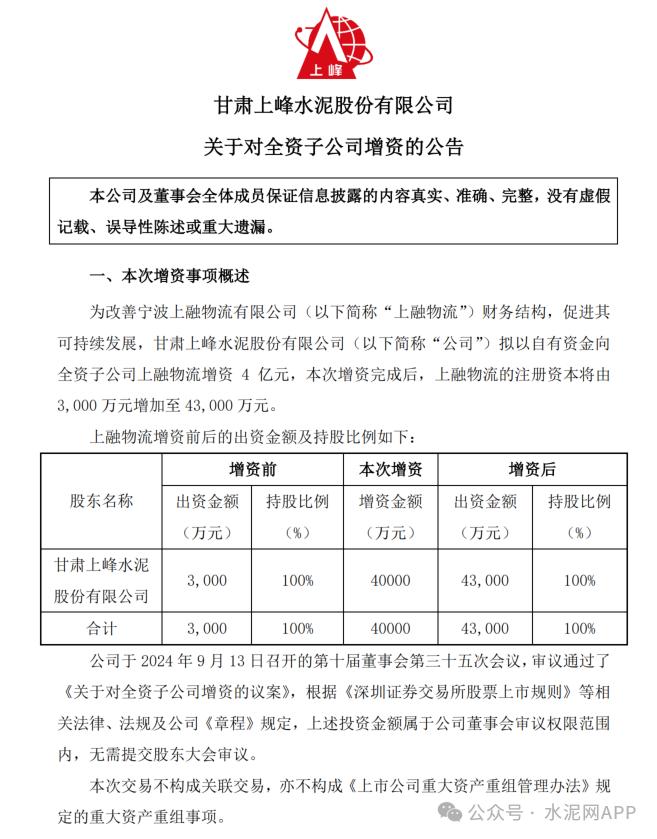 上峰水泥9月13日晚間公告,公司擬以自有資金向全資子公司上融物流增資4億元,本次增資完成后,上融物流的注冊(cè)資本將由3000萬(wàn)元增加至4.3億元。本次增資為進(jìn)一步改善和優(yōu)化寧波上融物流有限公司財(cái)務(wù)結(jié)構(gòu),促進(jìn)可持續(xù)發(fā)展,本次增資的資金來(lái)源為公司自有資金,不會(huì)對(duì)公司財(cái)務(wù)和經(jīng)營(yíng)狀況產(chǎn)生不利影響,不存在損害公司及股東利益的情形。