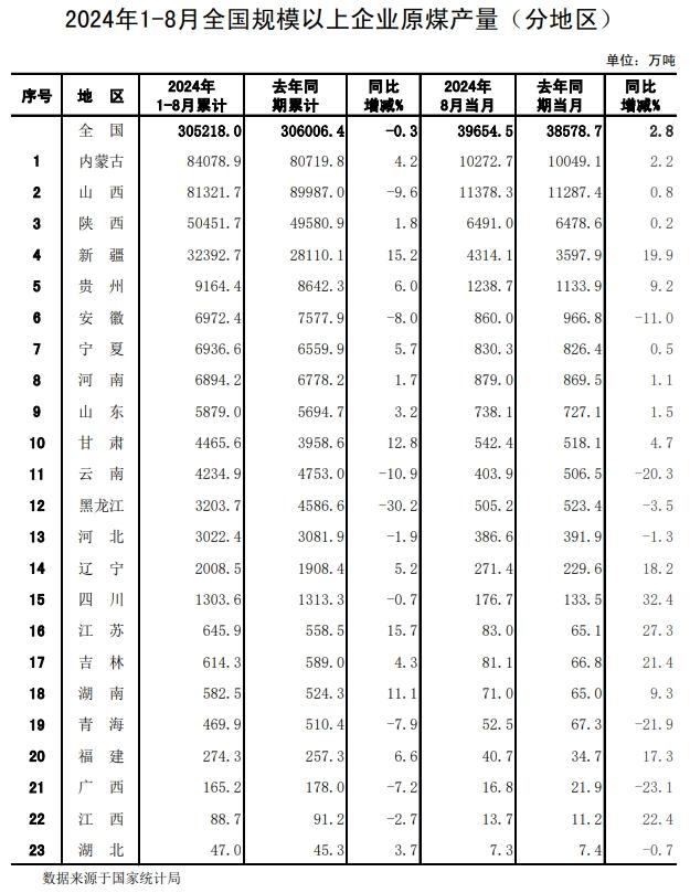 2024年1-8月份全國規(guī)模以上分省區(qū)原煤產(chǎn)量數(shù)據(jù)發(fā)布