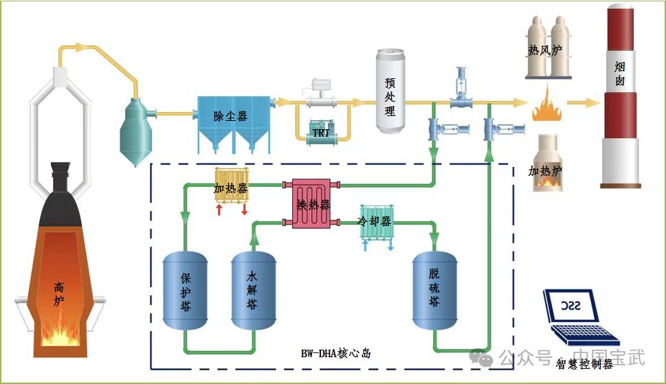 BW-DHA是寶武水務自主研發(fā)、具有獨立知識產(chǎn)權的高爐煤氣精脫硫源頭治理技術,具備“高、低、長”三大特征,“高”指高效率、“低”指低能耗、“長”指長壽命。同時,針對行業(yè)痛點,寶武水務研發(fā)出的“煤氣調(diào)質”“高活性抗毒水解劑”“熱量循環(huán)回收”“動態(tài)控溫”“智慧運行”等五大核心技術大大提升了煤氣的質量,使其能夠更好地應用于發(fā)電、加熱等環(huán)節(jié),提高能源利用效率,同時也減少了對周邊環(huán)境的影響。其中,煤氣調(diào)質技術采用多級預處理,能有效去除高爐煤氣中的有害物質,延長水解劑的使用壽命,穩(wěn)定TRT(高爐煤氣余壓透平發(fā)電裝置)出口煤氣溫度。