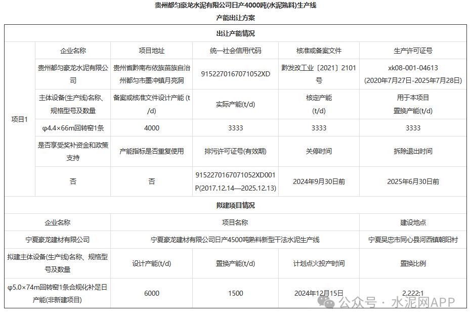 方案顯示,貴州都勻豪龍水泥出讓熟料產(chǎn)能3333t/d,用于寧夏豪龍建材生產(chǎn)線,置換產(chǎn)能1500t/d,置換比例2.222:1。