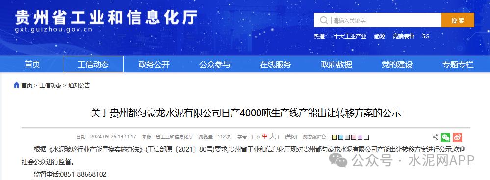 9月26日,貴州工信廳發(fā)布“關(guān)于貴州都勻豪龍水泥有限公司日產(chǎn)4000噸生產(chǎn)線產(chǎn)能出讓轉(zhuǎn)移方案的公示”。