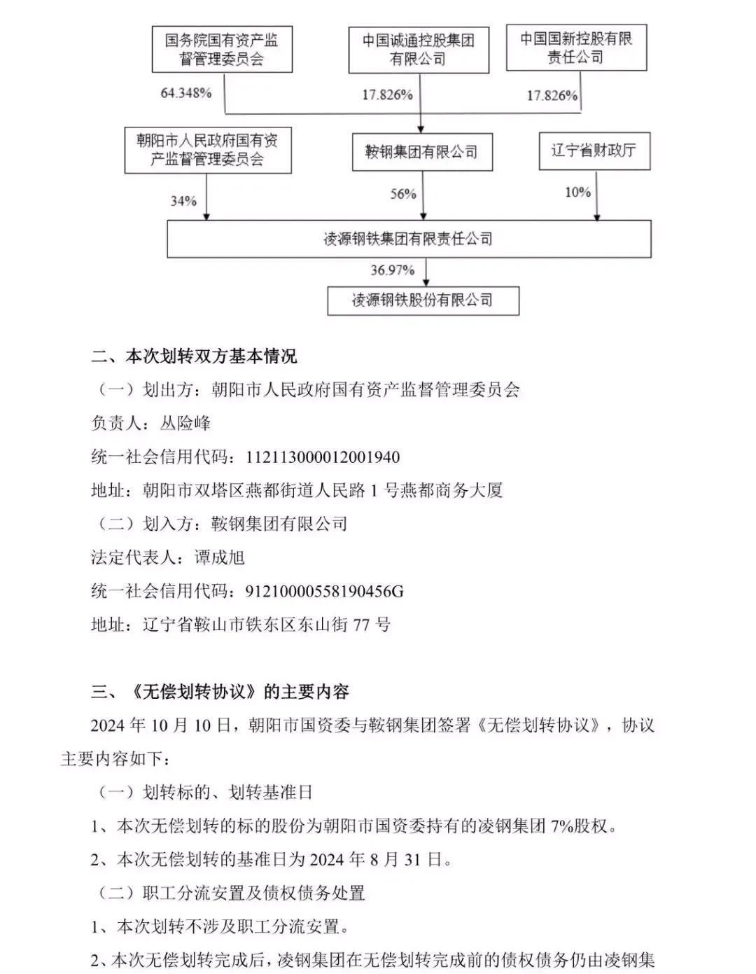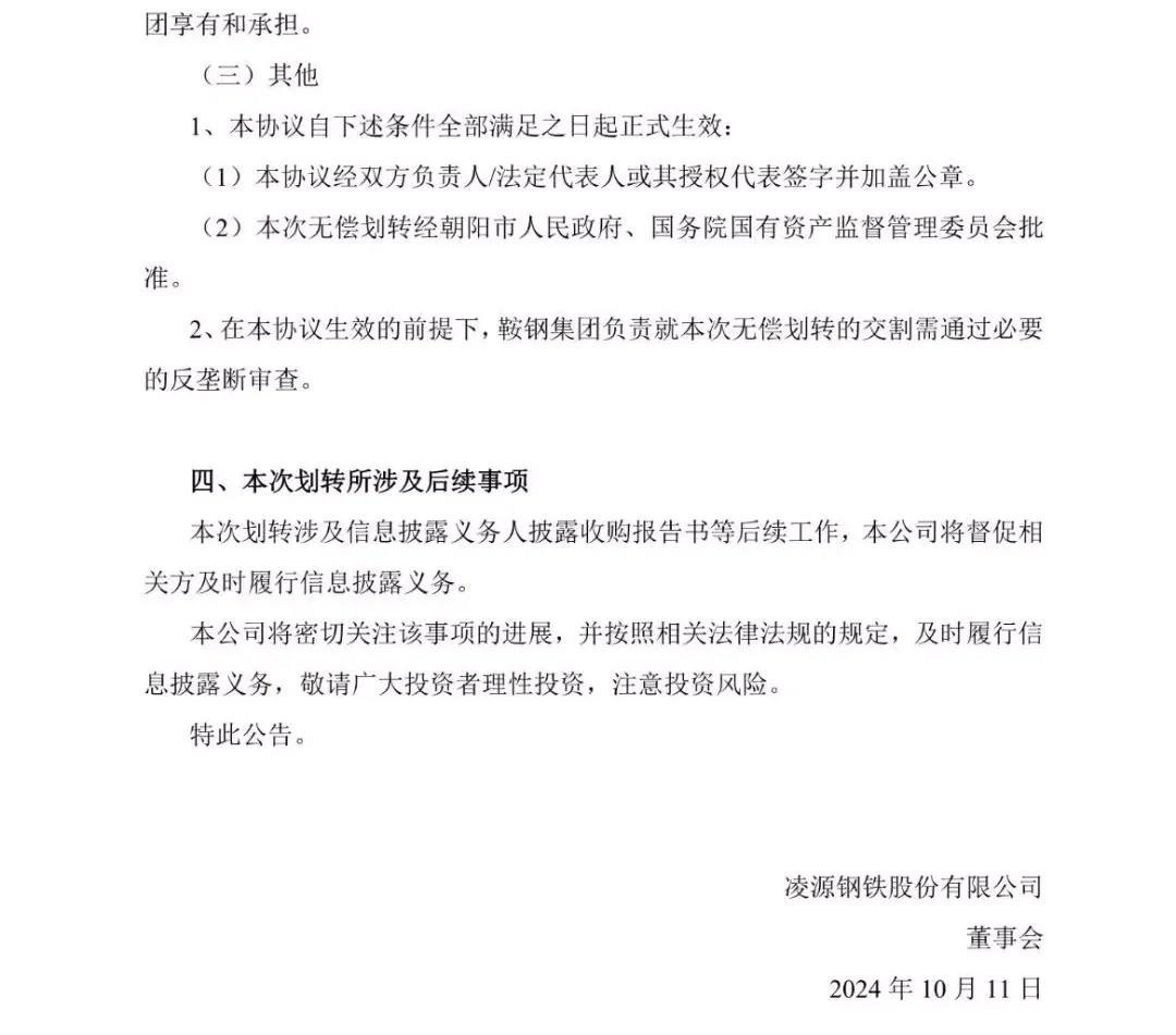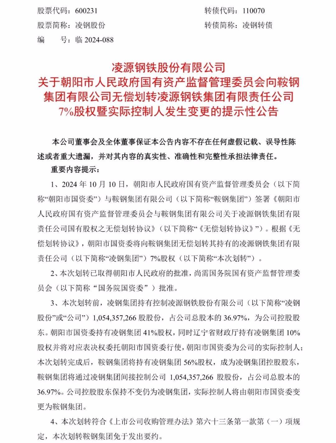 凌鋼股份10月10日晚間發(fā)布公告稱,朝陽市國資委與鞍鋼集團簽署《無償劃轉協(xié)議》,約定朝陽市國資委將向鞍鋼集團無償劃轉其持有的凌鋼集團 7%股權。本次劃轉已取得朝陽市人民政府的批準,尚需國務院國資委批準。