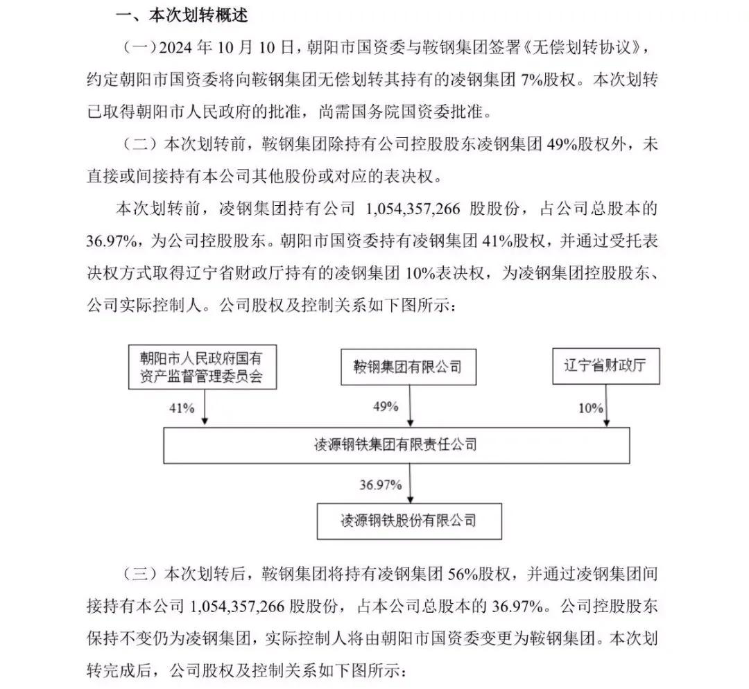 本次劃轉完成后,鞍鋼集團將持有凌鋼集團 56%股權,成為凌鋼集團控股股東,鞍鋼集團將通過凌鋼集團間接控制公司 1,054,357,266 股股份,占公司總股本的36.97%。公司控股股東保持不變仍為凌鋼集團,實際控制人將由朝陽市國資委變更為鞍鋼集團。
