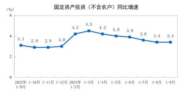 2024年前三季度,全國固定資產(chǎn)投資(不含農(nóng)戶)378978億元,同比增長3.4%(按可比口徑計(jì)算),其中,民間固定資產(chǎn)投資191001億元,下降0.2%。從環(huán)比看,9月份固定資產(chǎn)投資(不含農(nóng)戶)增長0.65%。