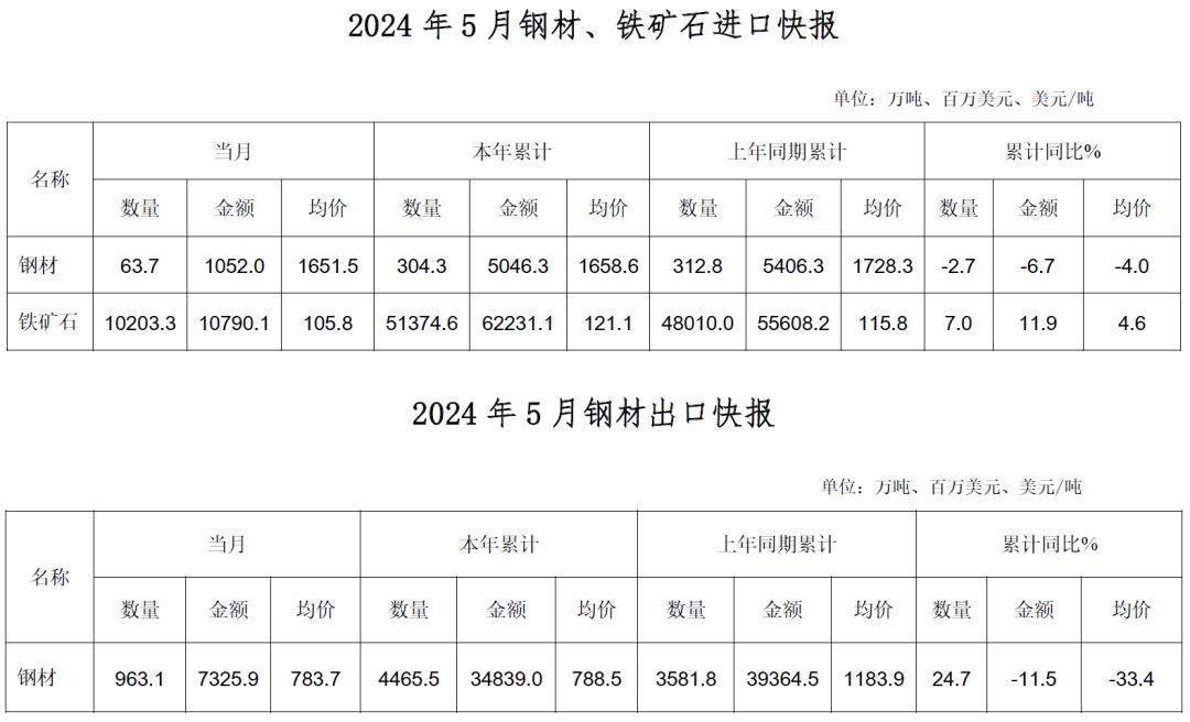 根據(jù)海關(guān)統(tǒng)計快訊數(shù)據(jù),2024年5月,我國進(jìn)口鋼材63.7萬噸,環(huán)比減少2.1萬噸,下降3.2%;均價1651.5美元/噸,環(huán)比減少55.9美元/噸,下降3.3%。1-5月累計進(jìn)口鋼材304.3萬噸,同比減少8.5萬噸,下降2.7%。
