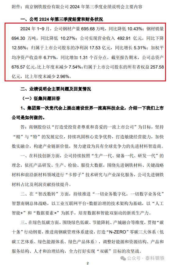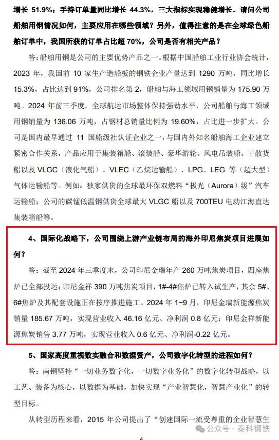 南鋼股份10月29日發(fā)布關(guān)于2024年第三季度業(yè)績說明會召開情況的公告,其中海外印尼焦炭項目進展:關(guān)于截至2024年三季度末,公司印尼金瑞年產(chǎn)260萬噸焦炭項目,四座焦爐已全部投運;印尼金祥390萬噸焦炭項目,1#-4#焦爐已轉(zhuǎn)入試生產(chǎn),其余5#、6#焦爐及其配套設(shè)施正在按序推進施工。2024年1~9月,印尼金瑞新能源焦炭銷量185.67萬噸,實現(xiàn)營業(yè)收入46.16億元、凈利潤0.8億元;印尼金祥新能源焦炭銷售3.77萬噸,實現(xiàn)營業(yè)收入0.6億元、凈利潤-0.22億元。具體如下: