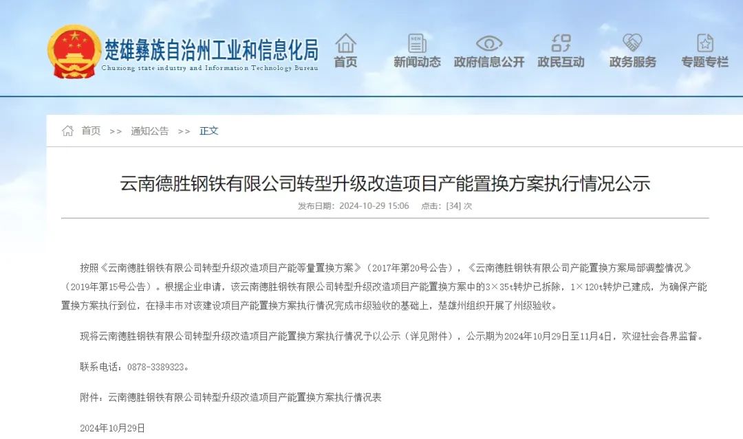 現(xiàn)將云南德勝鋼鐵有限公司轉(zhuǎn)型升級(jí)改造項(xiàng)目產(chǎn)能置換方案執(zhí)行情況予以公示(詳見(jiàn)附件),公示期為2024年10月29日至11月4日,歡迎社會(huì)各界監(jiān)督。