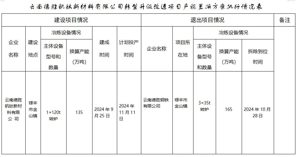 按照《云南德勝鋼鐵有限公司轉(zhuǎn)型升級(jí)改造項(xiàng)目產(chǎn)能等量置換方案》(2017年第20號(hào)公告),《云南德勝鋼鐵有限公司產(chǎn)能置換方案局部調(diào)整情況》(2019年第15號(hào)公告)。根據(jù)企業(yè)申請(qǐng),該云南德勝鋼鐵有限公司轉(zhuǎn)型升級(jí)改造項(xiàng)目產(chǎn)能置換方案中的3×35t轉(zhuǎn)爐已拆除,1×120t轉(zhuǎn)爐已建成,為確保產(chǎn)能置換方案執(zhí)行到位,在祿豐市對(duì)該建設(shè)項(xiàng)目產(chǎn)能置換方案執(zhí)行情況完成市級(jí)驗(yàn)收的基礎(chǔ)上,楚雄州組織開(kāi)展了州級(jí)驗(yàn)收。
