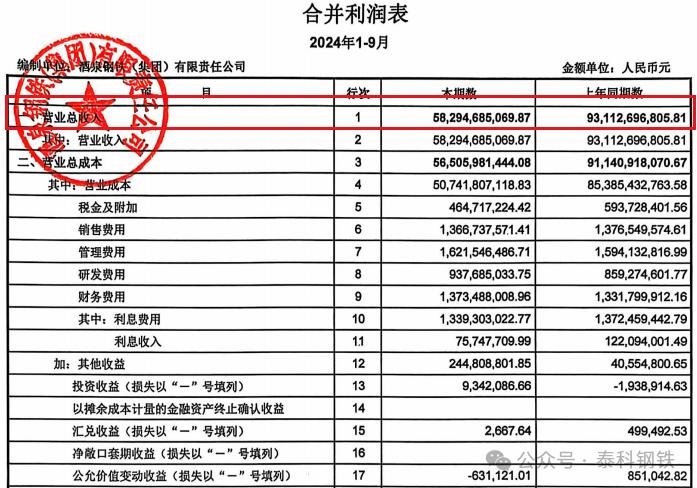 近日,酒泉鋼鐵(集團(tuán))有限責(zé)任公司2024年三季度合并及母公司財(cái)務(wù)報表公布,酒鋼集團(tuán)2024年1-9月營收582.95億元(2023年同期933.12億元),凈利潤11.64億元(2023年同期17.45億元)。