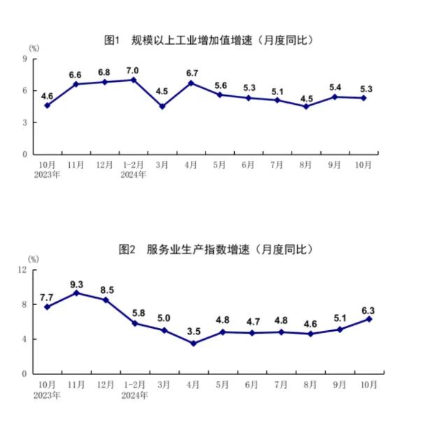 10月份,全國規(guī)模以上工業(yè)增加值同比增長5.3%,比上月回落0.1個(gè)百分點(diǎn);環(huán)比增長0.41%。分三大門類看,采礦業(yè)增加值同比增長4.6%,制造業(yè)增長5.4%,電力、熱力、燃?xì)饧八a(chǎn)和供應(yīng)業(yè)增長5.4%。裝備制造業(yè)增加值同比增長6.6%,高技術(shù)制造業(yè)增加值增長9.4%,分別快于全部規(guī)模以上工業(yè)增加值1.3和4.1個(gè)百分點(diǎn)。分經(jīng)濟(jì)類型看,國有控股企業(yè)增加值同比增長3.8%;股份制企業(yè)增長5.9%,外商及港澳臺投資企業(yè)增長2.9%;私營企業(yè)增長4.8%。分產(chǎn)品看,新能源汽車、工業(yè)機(jī)器人、集成電路產(chǎn)品產(chǎn)量同比分別增長48.6%、33.4%、11.8%。1-10月份,全國規(guī)模以上工業(yè)增加值同比增長5.8%,與1-9月份持平。10月份,制造業(yè)采購經(jīng)理指數(shù)為50.1%,比上月上升0.3個(gè)百分點(diǎn);企業(yè)生產(chǎn)經(jīng)營活動預(yù)期指數(shù)為54.0%,上升2.0個(gè)百分點(diǎn)。1-9月份,全國規(guī)模以上工業(yè)企業(yè)實(shí)現(xiàn)利潤總額52282億元,同比下降3.5%。