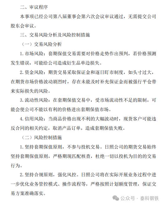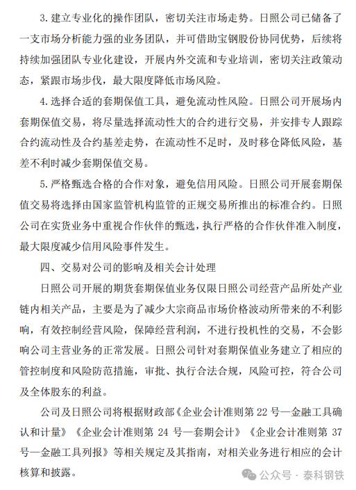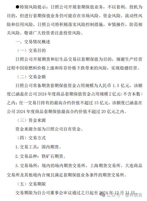 公告披露,山鋼日照常備期貨套期保值資金占用規(guī)模為1.5億元,該額度已涵蓋在該公司2024年度商品套期保值資金占用規(guī)模2億元(不含本數(shù))之內(nèi);任一交易日持有的最高合約價(jià)值不超過15億元,該額度已涵蓋在該公司2024年度商品套期保值最高合約價(jià)值不超過20億元之內(nèi)。該公司擬開展商品類金融衍生品業(yè)務(wù)的品種為鐵礦石期貨,期貨交易以套期保值為目的,規(guī)避生產(chǎn)經(jīng)營過程中因原燃料價(jià)格上漲和庫存價(jià)格下跌帶來的風(fēng)險(xiǎn),實(shí)現(xiàn)穩(wěn)健經(jīng)營。