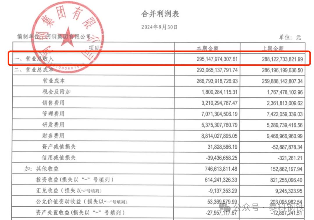 近日,河鋼集團有限公司2024年三季度合并及母公司財務報表公布,河鋼集團2024年1-9月營收2951.48億元(2023年同期2881.23億元),凈利潤18.21億元(2023年同期16.61億元),同比均逆勢增長!