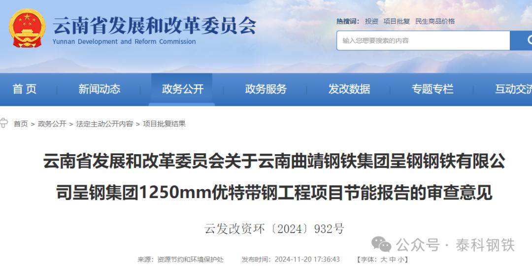 《曲靖市發(fā)展和改革委員會關(guān)于云南曲靖鋼鐵集團呈鋼鋼鐵有限公司呈鋼集團1250mm優(yōu)特帶鋼工程項目節(jié)能審查的請示》(曲發(fā)改資環(huán)〔2024〕70號)收悉。根據(jù)《中華人民共和國節(jié)約能源法》《固定資產(chǎn)投資項目節(jié)能審查辦法》(國家發(fā)展改革委令2023年第2號)、《云南省固定資產(chǎn)投資項目節(jié)能審查實施辦法》(云發(fā)改資環(huán)規(guī)〔2024〕2號)有關(guān)要求,省發(fā)展改革委委托云南省節(jié)能監(jiān)察中心組織有關(guān)專家對該項目(項目代碼:2402-530321-04-01-337223)節(jié)能報告進行了評審,對項目能源消費情況、能效水平、用能工藝及節(jié)能管理措施等提出如下意見: