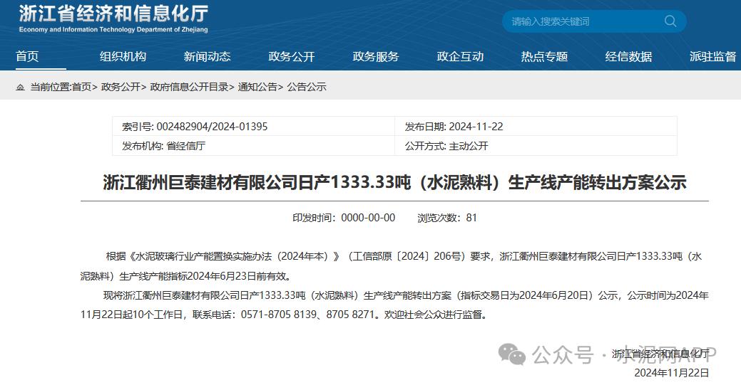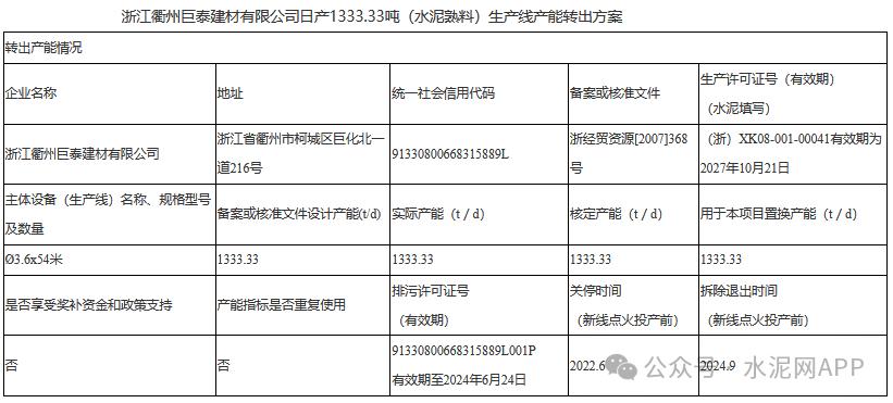 11月22日,浙江省經(jīng)信廳發(fā)布“浙江衢州巨泰建材有限公司日產(chǎn)1333.33噸(水泥熟料)生產(chǎn)線產(chǎn)能轉(zhuǎn)出方案公示”。
