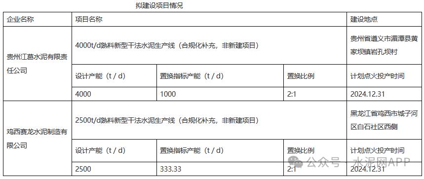 根據(jù)公示,浙江衢州巨泰建材1333.33t/d水泥熟料生產(chǎn)線產(chǎn)能轉(zhuǎn)出,用于補充貴州江葛水泥4000t/d熟料生產(chǎn)線(置換補充1000t/d)、雞西賽龍水泥2500t/d熟料生產(chǎn)線(置換補充333.33t/d)產(chǎn)能。