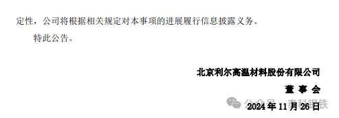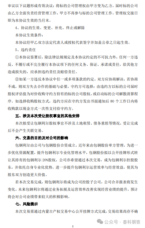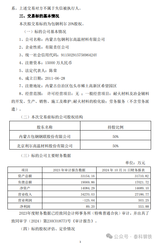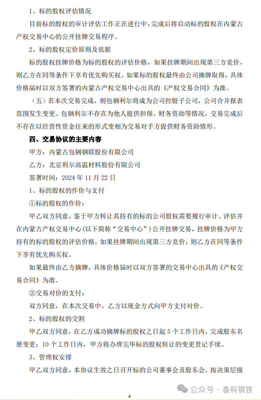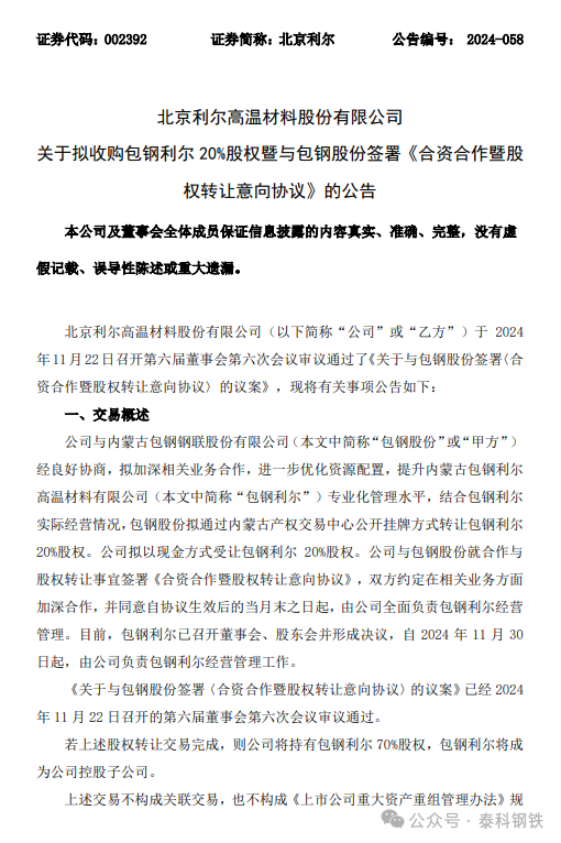 北京利爾11月25日晚間公告,公司與包鋼股份擬加深相關(guān)業(yè)務(wù)合作,包鋼股份擬公開(kāi)掛牌轉(zhuǎn)讓內(nèi)蒙古包鋼利爾高溫材料有限公司(簡(jiǎn)稱“包鋼利爾”)20%股權(quán),公司擬以現(xiàn)金受讓包鋼利爾20%股權(quán)。公司與包鋼股份就此簽署意向協(xié)議,雙方約定在相關(guān)業(yè)務(wù)方面加深合作,并同意自協(xié)議生效后的當(dāng)月末之日起,由公司全面負(fù)責(zé)包鋼利爾經(jīng)營(yíng)管理。若此次交易完成,公司將持有包鋼利爾70%股權(quán),包鋼利爾將成為公司控股子公司。