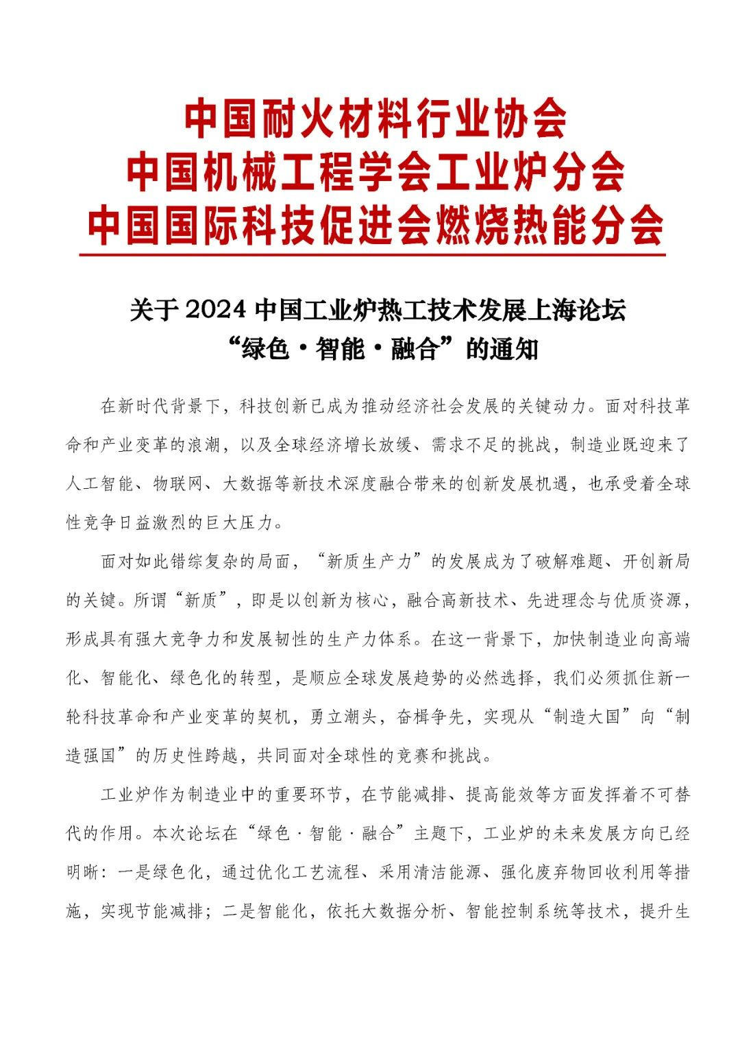 中耐協(xié):關(guān)于2024 中國(guó)工業(yè)爐熱工技術(shù)發(fā)展上海論壇“綠色·智能·融合”的通知