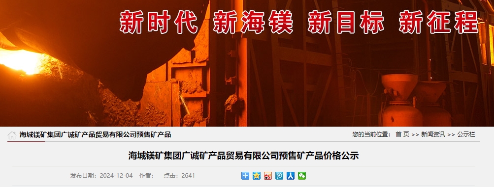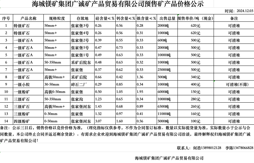 海鎂集團廣誠礦產品貿易有限公司預售礦產品價格公示