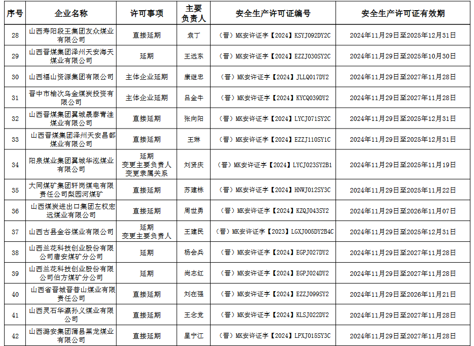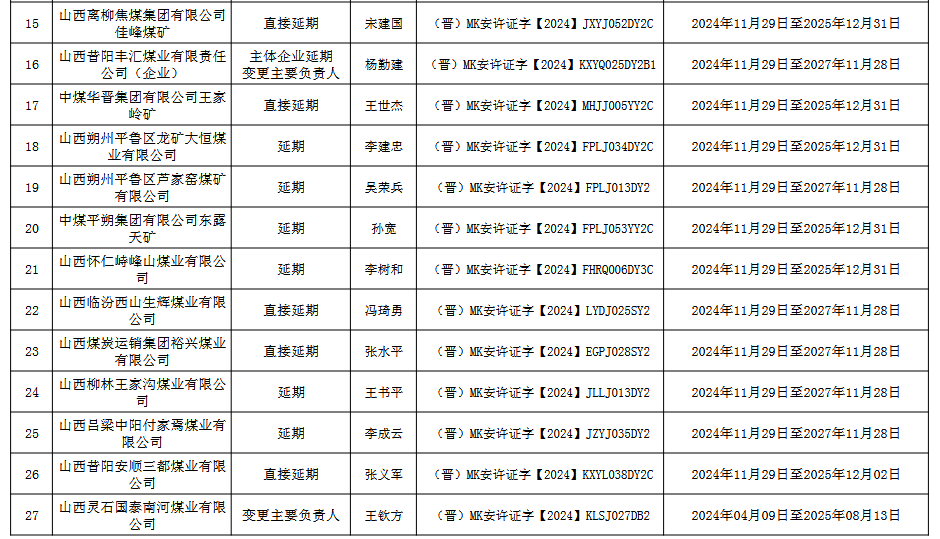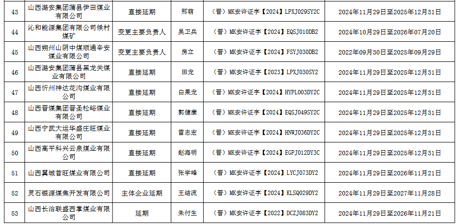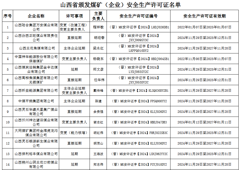 山西省應(yīng)急管理廳關(guān)于頒發(fā)煤礦(企業(yè))安全生產(chǎn)許可證的公告 經(jīng)研究,按照有關(guān)規(guī)定,為山西陸合集團(tuán)萬安煤業(yè)有限公司等53座煤礦(企業(yè))頒發(fā)安全生產(chǎn)許可證,現(xiàn)進(jìn)行公告。 公告期:2024年11月30日至2024年12月06日。