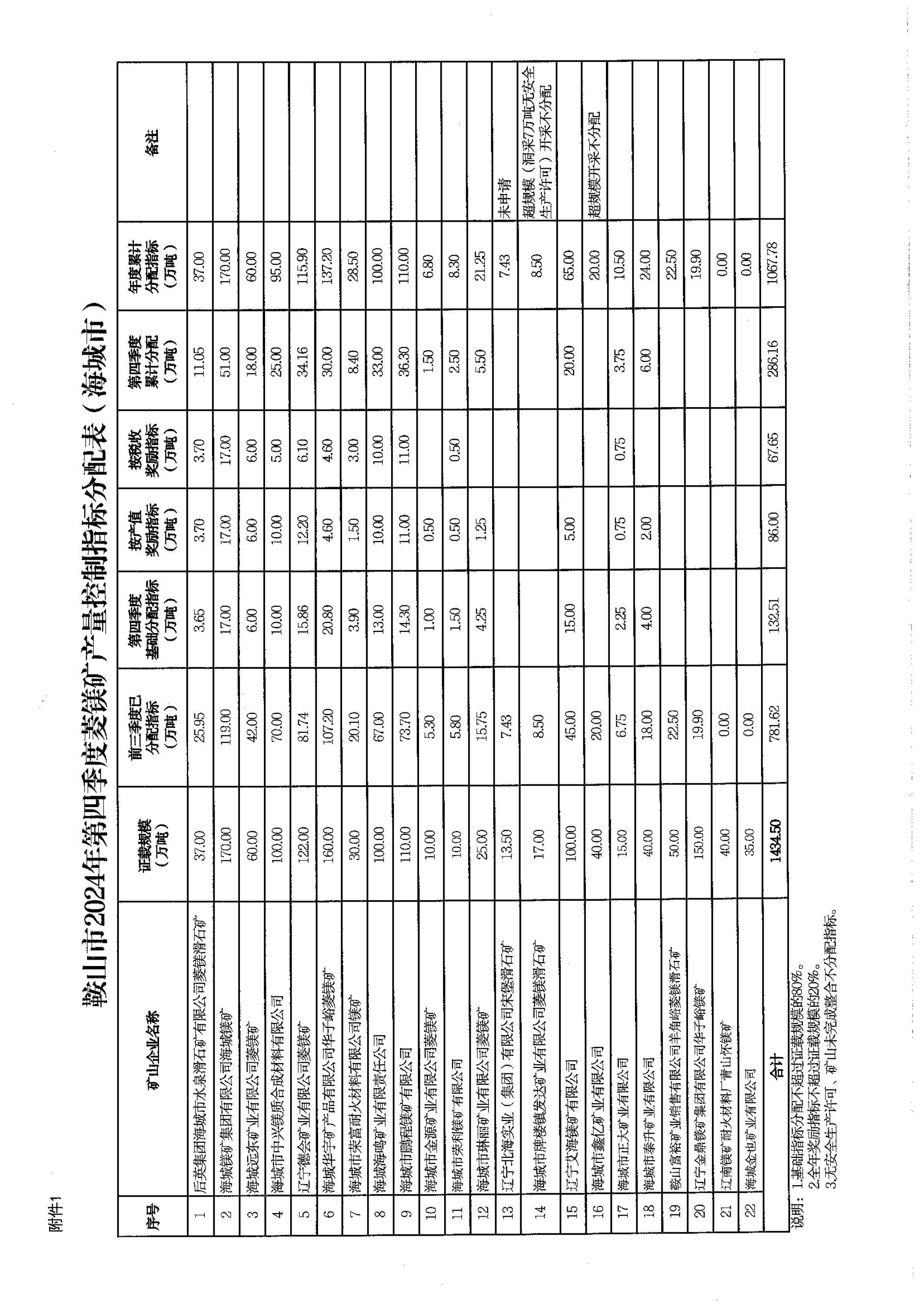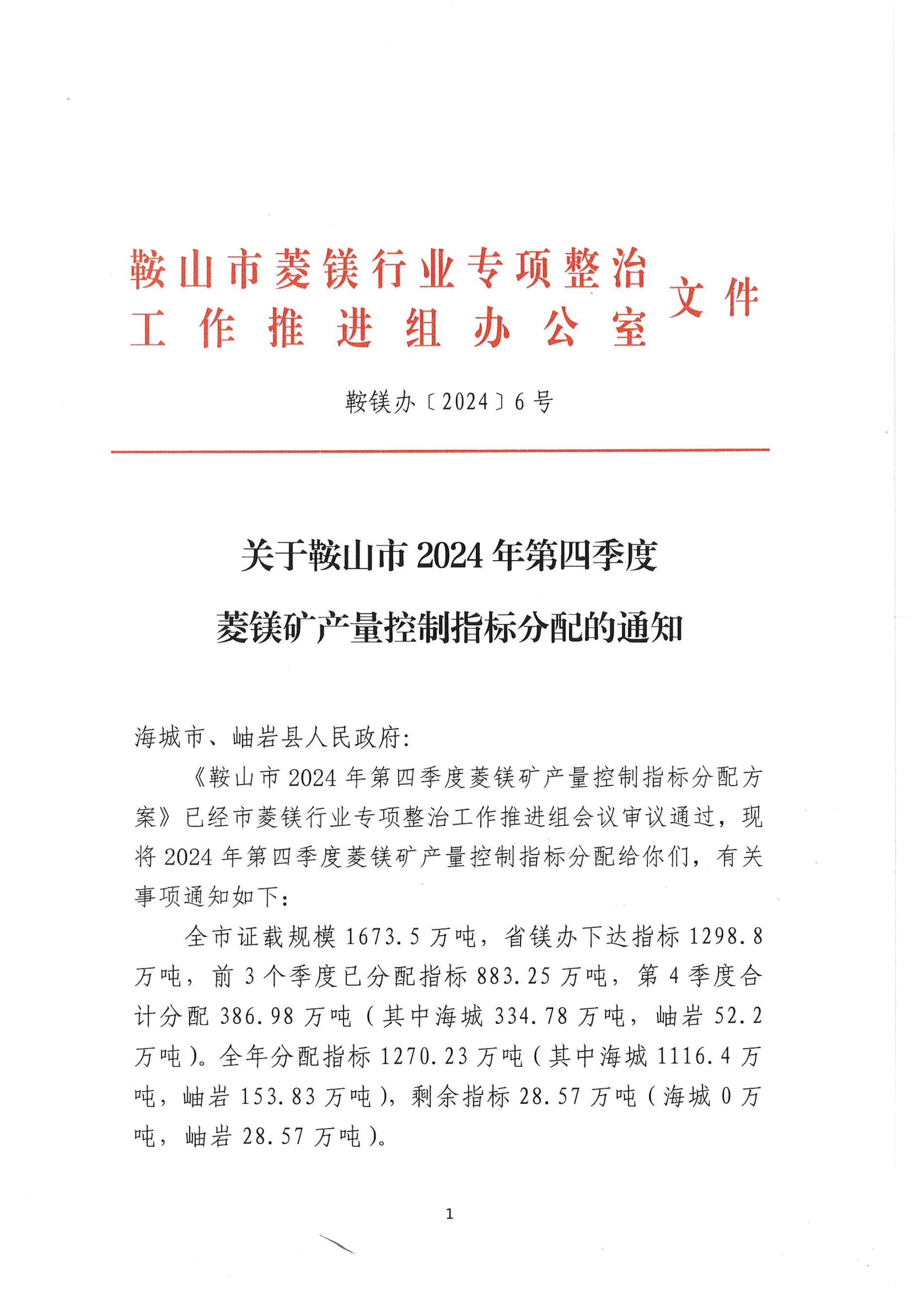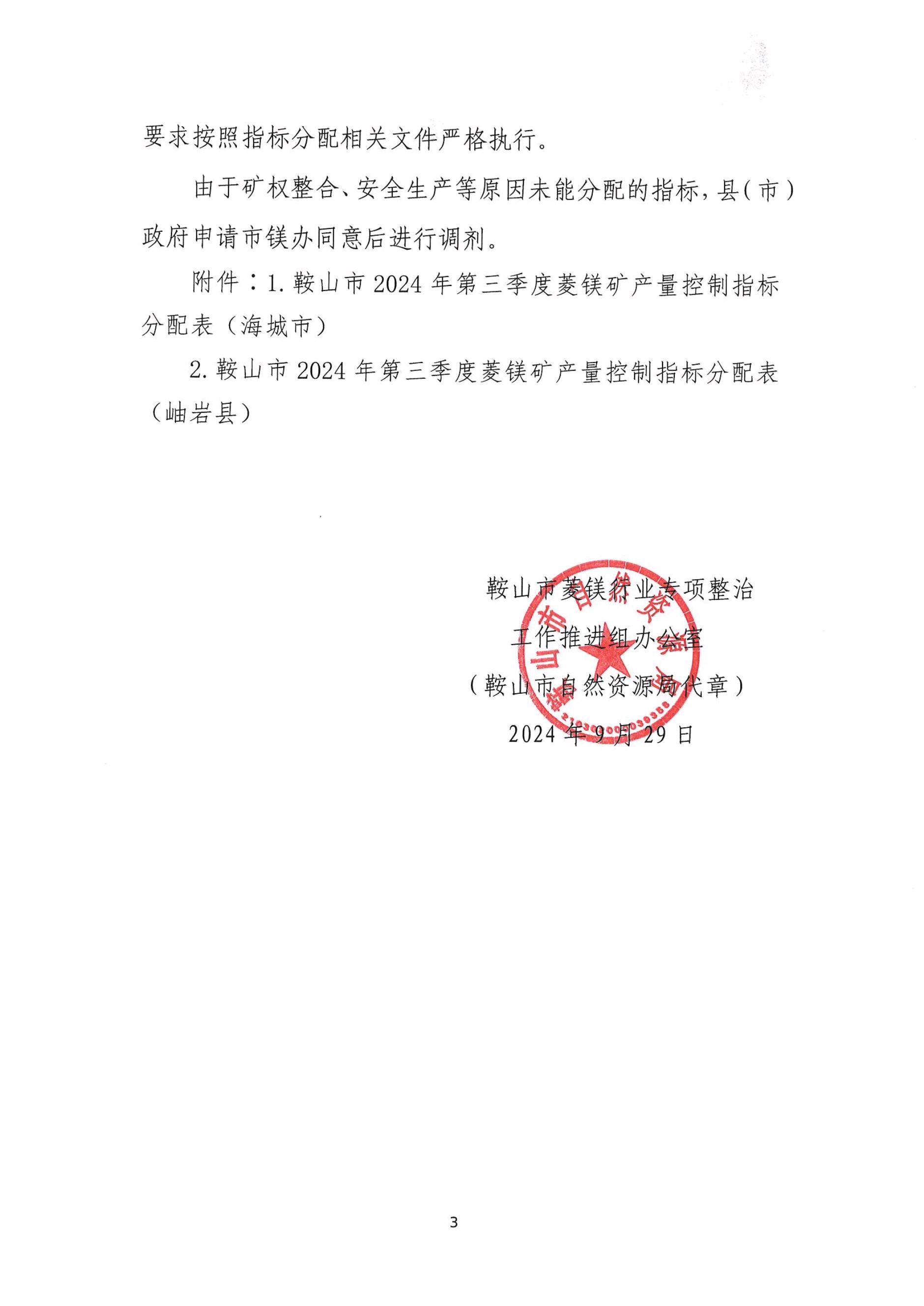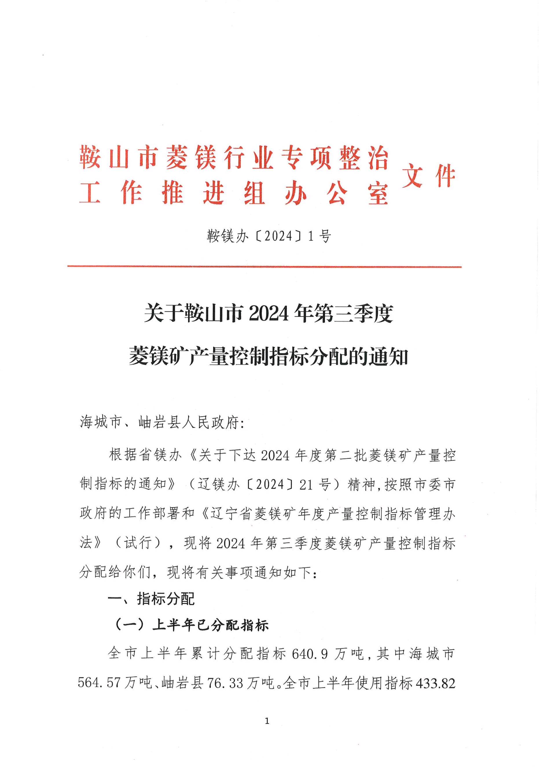 關(guān)于鞍山市2024年第三,第四季度菱鎂礦產(chǎn)量控制指標(biāo)分配的通知