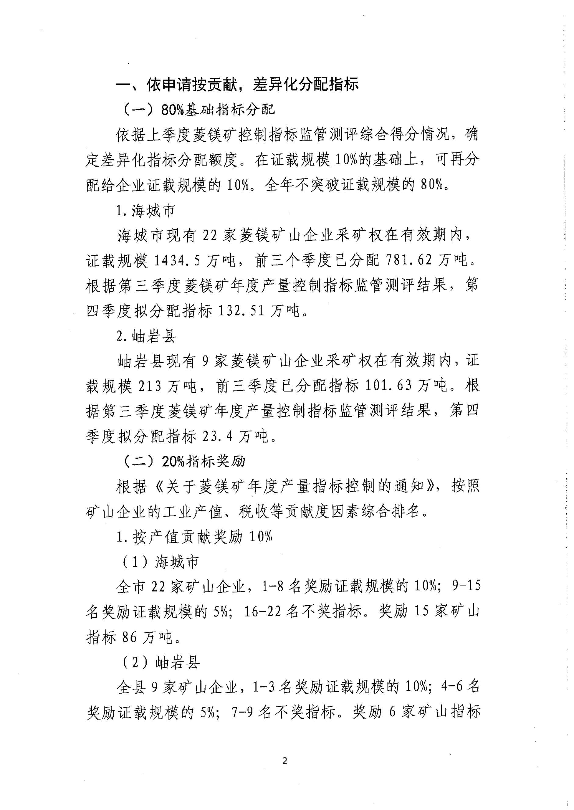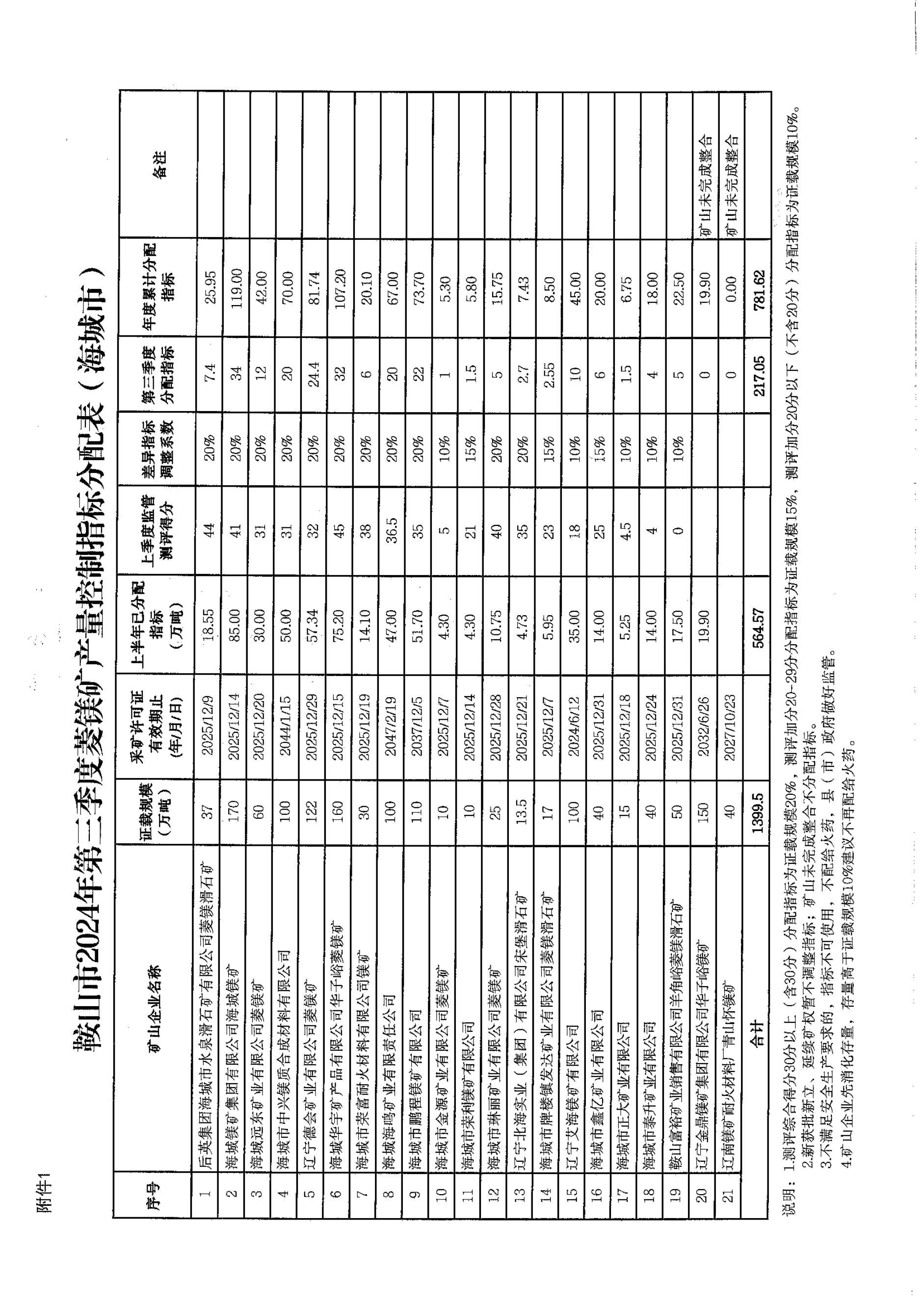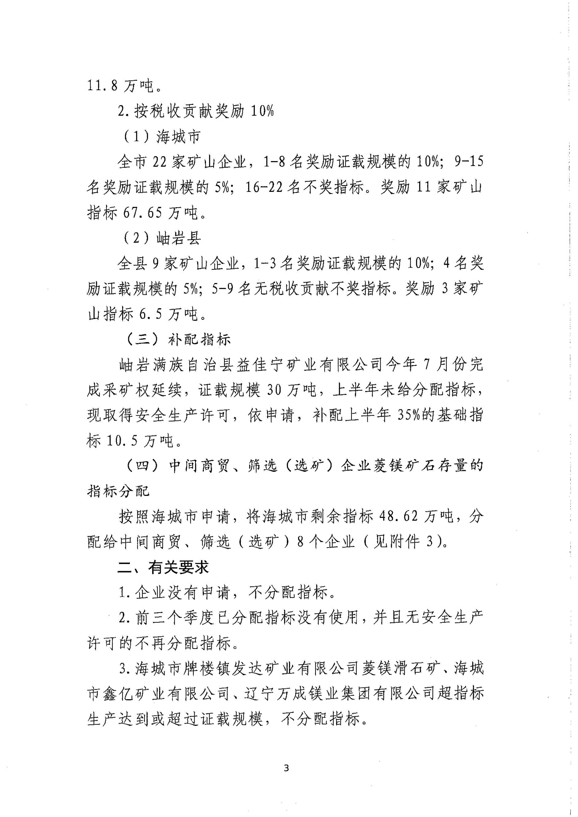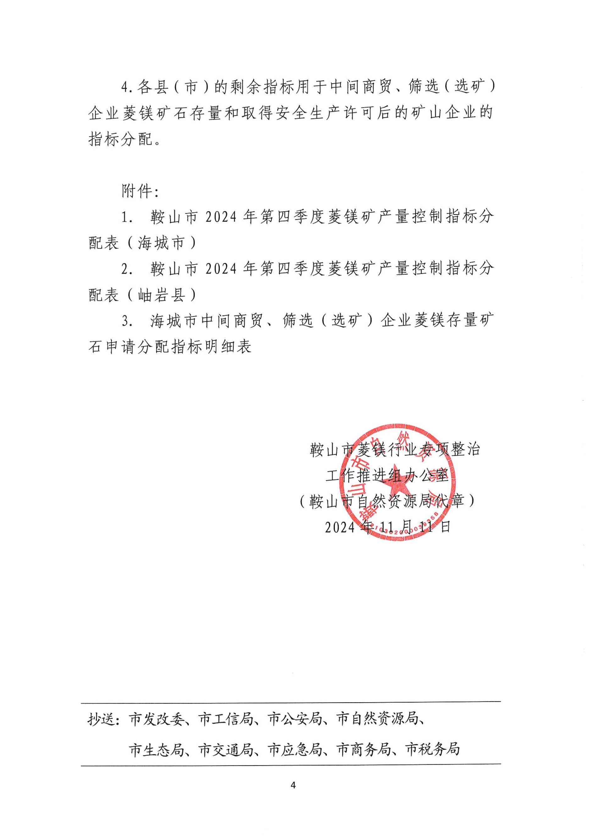 關(guān)于鞍山市2024年第三,第四季度菱鎂礦產(chǎn)量控制指標(biāo)分配的通知