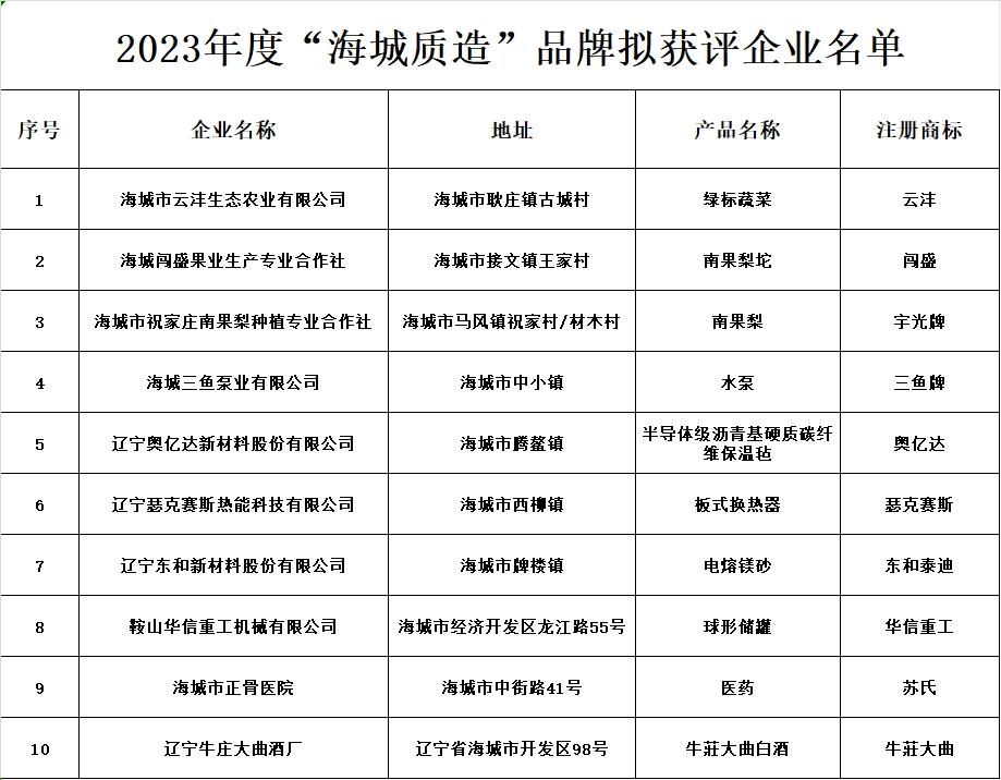 為深入貫徹中共中央、國務院《質(zhì)量強國建設(shè)綱要》,按照《新時代“海城質(zhì)造”品牌工作三年行動方案》要求,“海城質(zhì)造”品牌評審委員會辦公室已組織完成對申報2023年度“海城質(zhì)造”品牌企業(yè)的評審工作?,F(xiàn)將2023年度“海城質(zhì)造”品牌擬獲評單位向社會公示(名單附后)。