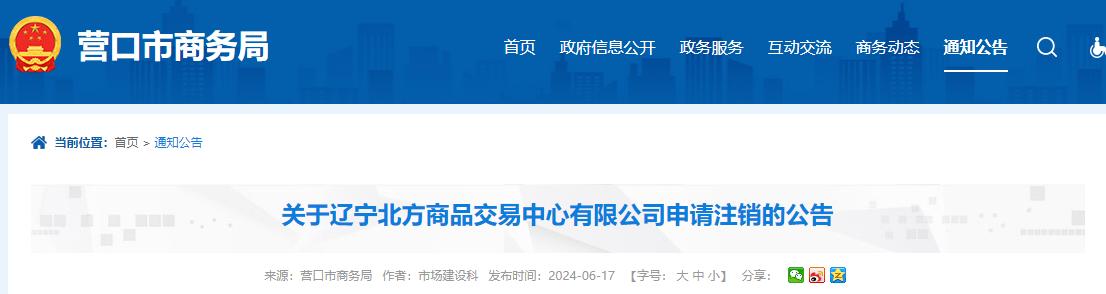 近日,營口市商務(wù)局收到遼寧北方商品交易中心有限公司提交的公司注銷申請,該公司因股東集體決議,決定解散遼寧北方商品交易中心有限公司。注銷公告已于2024年5月21日在國家企業(yè)信用信息公示系統(tǒng)上進(jìn)行公示,請各有關(guān)方及時關(guān)注,如對遼寧北方商品交易中心有限公司注銷事宜有異議,請于公告截止日前在國家企業(yè)信用信息公示系統(tǒng)上提出,并同時電話或郵件告知營口市商務(wù)局。