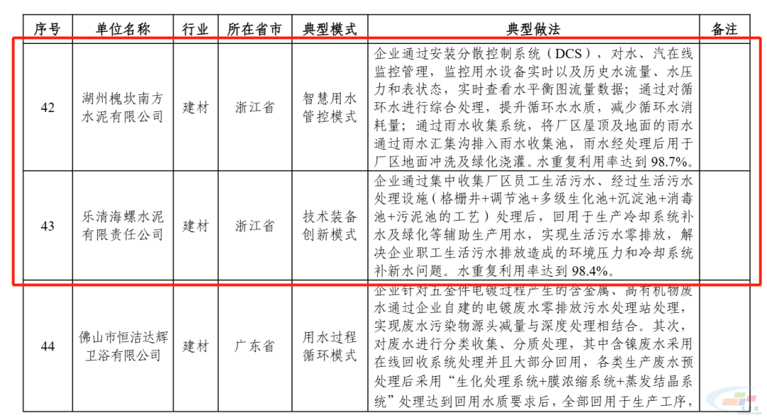 水泥行業(yè),湖州槐坎南方水泥有限公司的“智慧用水管控模式”;樂清海螺水泥有限責任公司的“技術裝備創(chuàng)新模式”被列入2024年工業(yè)廢水循環(huán)利用典型案例名單。
