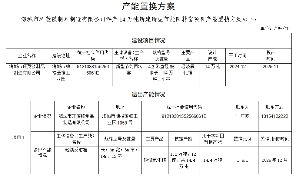 附件7.海城市環(huán)菱鎂制品制造有限公司產(chǎn)能置換方案