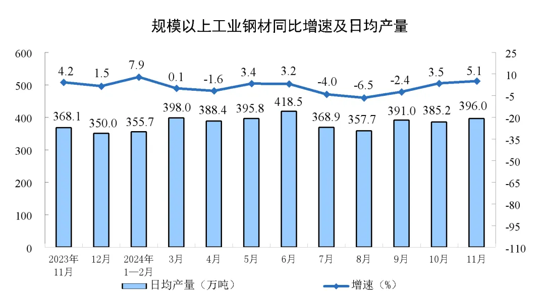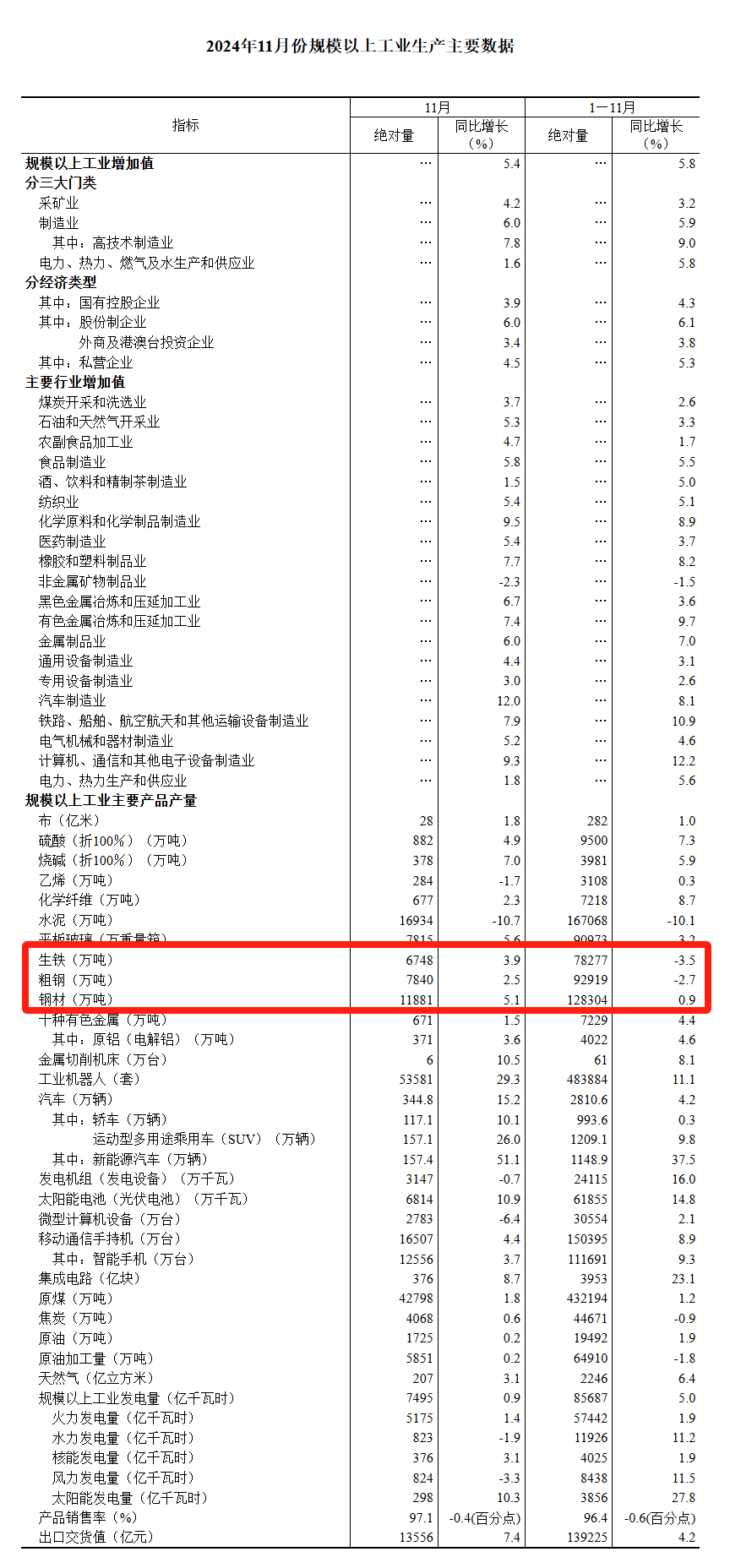 國(guó)家統(tǒng)計(jì)局公布的數(shù)據(jù)顯示,11月份,我國(guó)粗鋼產(chǎn)量為7840萬(wàn)噸,同比增長(zhǎng)2.5%;生鐵產(chǎn)量為6748萬(wàn)噸,同比增長(zhǎng)3.9%;鋼材產(chǎn)量為11881萬(wàn)噸,同比增長(zhǎng)5.1%。1-11月份,我國(guó)粗鋼產(chǎn)量為92919萬(wàn)噸,同比下降2.7%;生鐵產(chǎn)量為78277萬(wàn)噸,同比下降3.5%;鋼材產(chǎn)量為128304萬(wàn)噸,同比增長(zhǎng)0.9%。11月份,41個(gè)大類(lèi)行業(yè)中有34個(gè)行業(yè)增加值保持同比增長(zhǎng)。其中,煤炭開(kāi)采和洗選業(yè)增長(zhǎng)3.7%,石油和天然氣開(kāi)采業(yè)增長(zhǎng)5.3%,農(nóng)副食品加工業(yè)增長(zhǎng)4.7%,酒、飲料和精制茶制造業(yè)增長(zhǎng)1.5%,紡織業(yè)增長(zhǎng)5.4%,化學(xué)原料和化學(xué)制品制造業(yè)增長(zhǎng)9.5%,非金屬礦物制品業(yè)下降2.3%,黑色金屬冶煉和壓延加工業(yè)增長(zhǎng)6.7%,有色金屬冶煉和壓延加工業(yè)增長(zhǎng)7.4%,通用設(shè)備制造業(yè)增長(zhǎng)4.4%,專(zhuān)用設(shè)備制造業(yè)增長(zhǎng)3.0%,汽車(chē)制造業(yè)增長(zhǎng)12.0%,鐵路、船舶、航空航天和其他運(yùn)輸設(shè)備制造業(yè)增長(zhǎng)7.9%,電氣機(jī)械和器材制造業(yè)增長(zhǎng)5.2%,計(jì)算機(jī)、通信和其他電子設(shè)備制造業(yè)增長(zhǎng)9.3%,電力、熱力生產(chǎn)和供應(yīng)業(yè)增長(zhǎng)1.8%。