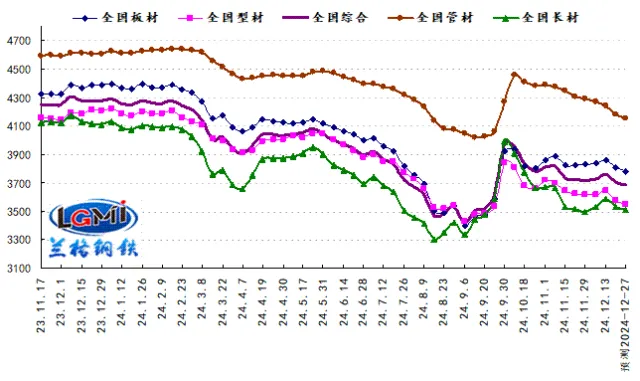 2024年第51周(2024.12.16-12.20)蘭格鋼鐵全國(guó)絕對(duì)價(jià)格指數(shù)為3708元,較上周下降1.2%,較去年同期下降12.9%;其中,蘭格鋼鐵長(zhǎng)材絕對(duì)價(jià)格指數(shù)為3535元,較上周下降1.2%,較去年同期下降13.9%;蘭格鋼鐵型材絕對(duì)價(jià)格指數(shù)為3574元,較上周下降1.9%,較去年同期下降14.3%;蘭格鋼鐵板材絕對(duì)價(jià)格指數(shù)為3811元,較上周下降1.1%,較去年同期下降12.6%;蘭格鋼鐵管材絕對(duì)價(jià)格指數(shù)為4177元,較上周下降1.5%,較去年同期下降9.2%。