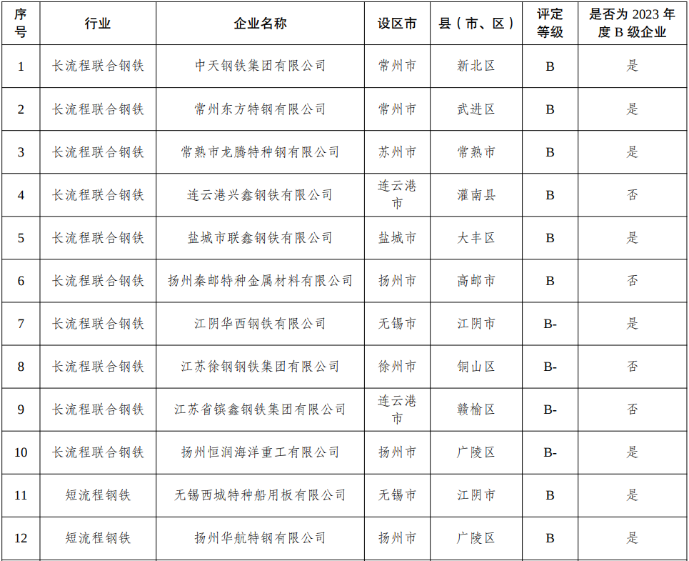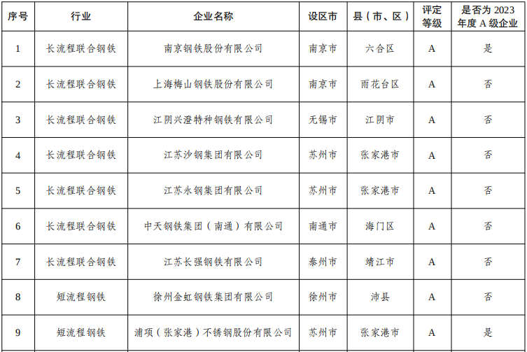 從《公示》中獲悉,包括南京鋼鐵股份有限公司、上海梅山鋼鐵股份有限公司在內(nèi)的9家鋼企為重污染天氣重點(diǎn)行業(yè)績效評(píng)價(jià)A級(jí)企業(yè),中天鋼鐵集團(tuán)有限公司等12家鋼廠為B(含B-)級(jí)企業(yè)。