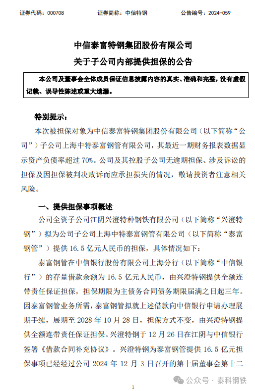 中信特鋼12月27日發(fā)布公告,中信泰富特鋼集團股份有限公司全資子公司江陰興澄特種鋼鐵有限公司擬為公司子公司上海中特泰富鋼管有限公司提供16.5億元人民幣的擔保。