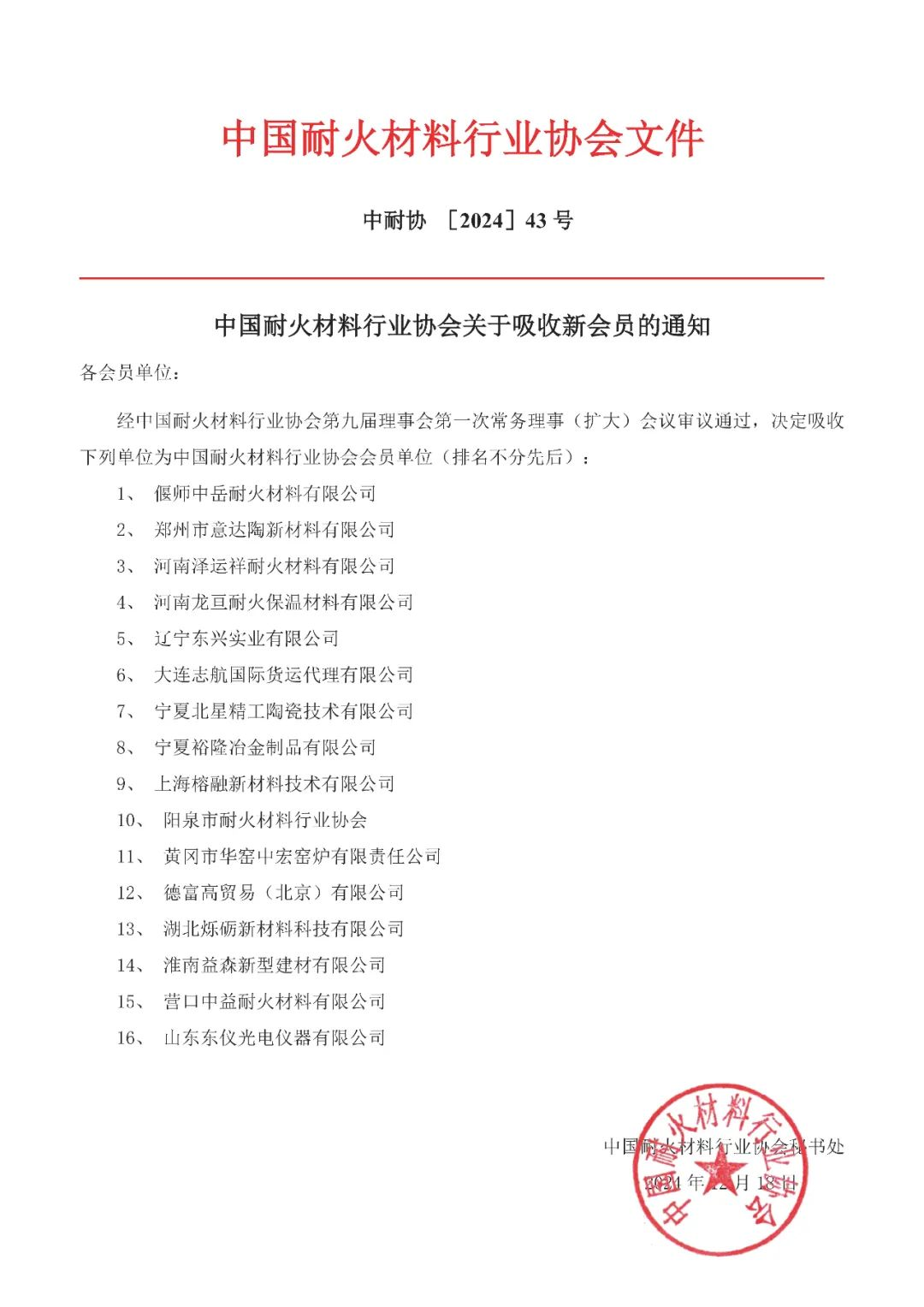 經(jīng)中國耐火材料行業(yè)協(xié)會第九屆理事會第一次常務理事(擴大)會議審議通過,決定吸收下列單位為中國耐火材料行業(yè)協(xié)會會員單位(排名不分先后):