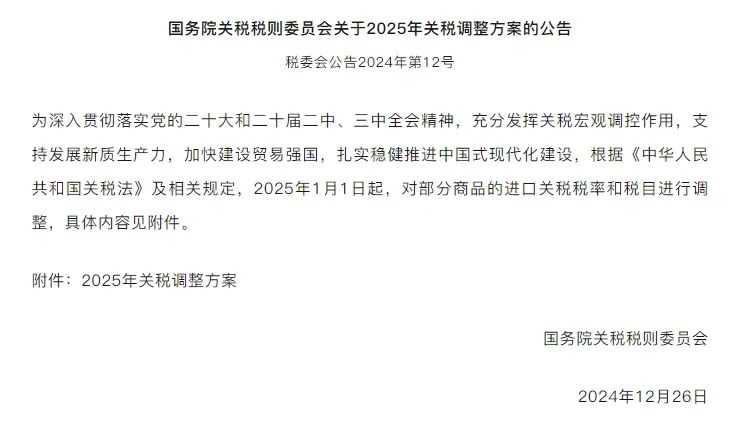 經(jīng)國務(wù)院批準,國務(wù)院關(guān)稅稅則委員會2024年12月28日對外發(fā)布公告,2025年將調(diào)整部分商品的進口關(guān)稅稅率和稅目,自今天起正式實施。