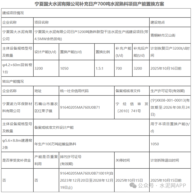 12月31日,寧夏工信廳發(fā)布“關(guān)于寧夏國大水泥有限公司補充日產(chǎn)700噸水泥熟料項目產(chǎn)能置換方案的公示”。