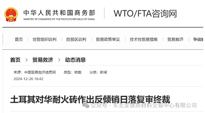 2024年12月20日,土耳其貿(mào)易部發(fā)布第2024/36號(hào)公告,對(duì)原產(chǎn)于中國(guó)的鉻鐵礦、菱鎂礦和鉻菱鎂礦耐火磚(土耳其語(yǔ):kromit ate? tu?lalar, magnezit ate? tu?lalar, krom magnezit ate? tu?lalar, magnezit, dolomit veya kromit i?erenler (dolomit i?erenler hari?; magnezyum oksit esasl?, 3 mm ile 30mm aras? kal?nl?klarda yap? levhalar? hari?)作出反傾銷第三次日落復(fù)審肯定性終裁,決定維持2018年9月5日第2018/28號(hào)公告確定的反傾銷稅不變,繼續(xù)對(duì)涉案產(chǎn)品征收200美元/噸的反傾銷稅。本案涉及土耳其稅號(hào)6902.10.00.10.11、6902.10.00.10.12、6902.10.00.10.13和6815.91項(xiàng)下的產(chǎn)品,但不包括厚度在3毫米至30毫米之間的氧化鎂建筑板。措施自公告發(fā)布之日起生效,有效期為五年。