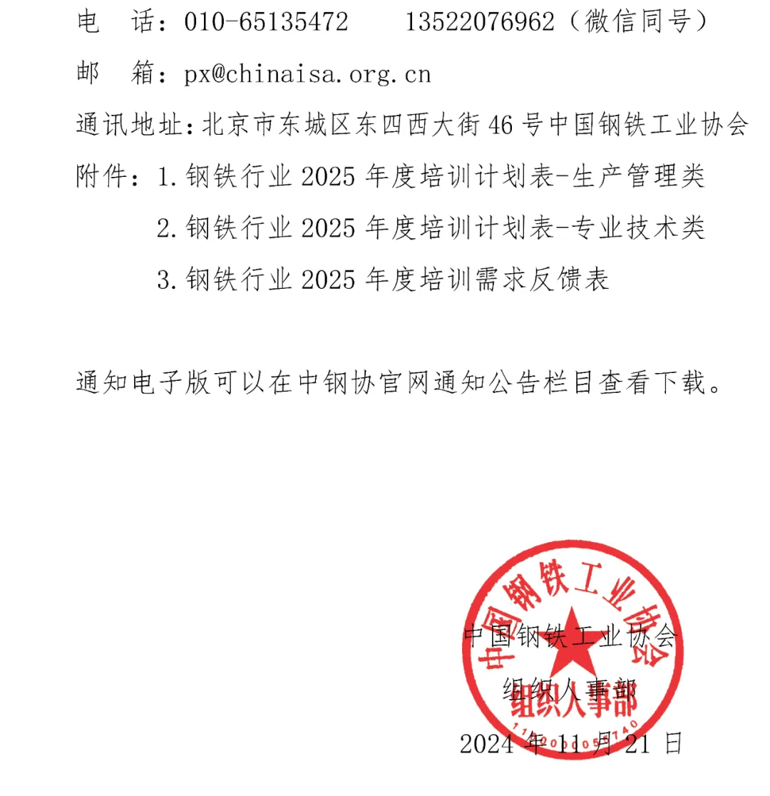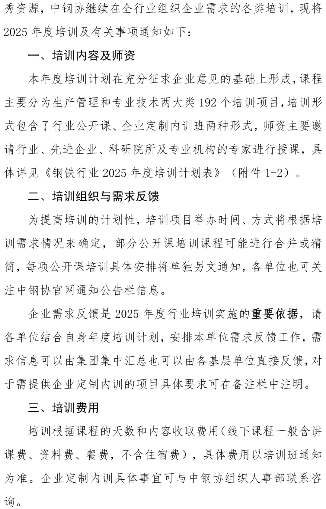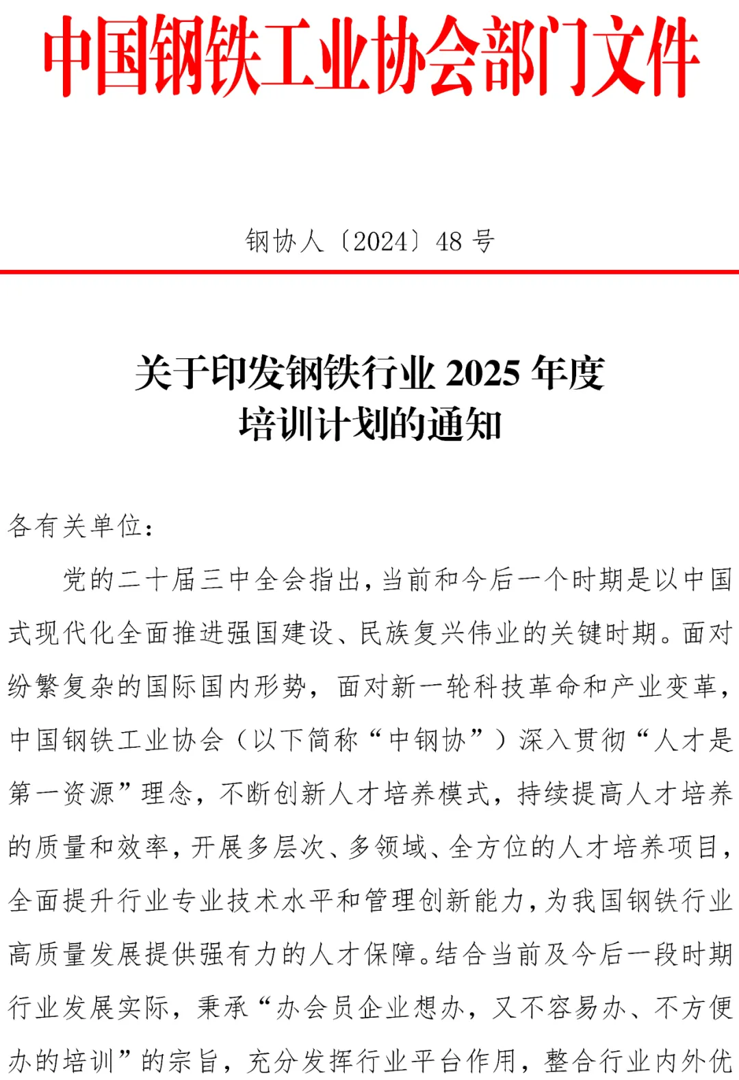 關于印發(fā)鋼鐵行業(yè)2025年度培訓計劃的通知?