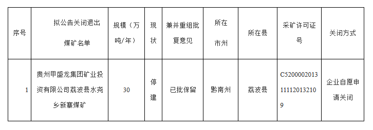 根據(jù)《國務(wù)院關(guān)于煤炭行業(yè)化解過剩產(chǎn)能實(shí)現(xiàn)脫困發(fā)展的意見》(國發(fā)〔2016〕7號(hào))、《關(guān)于加快推進(jìn)兼并重組煤礦分類處置促進(jìn)煤炭產(chǎn)業(yè)轉(zhuǎn)型升級(jí)發(fā)展的通知》(黔能源煤炭〔2020〕100號(hào))、《省能源局關(guān)于進(jìn)一步做好煤炭產(chǎn)能置換工作的通知》(黔能源發(fā)〔2022〕14號(hào))等文件精神,依企業(yè)申請,經(jīng)屬地政府同意,現(xiàn)按程序?qū)?025年第一批自愿申請關(guān)閉煤礦名單進(jìn)行公示(見下表),公示時(shí)間:2025年1月8日至2025年1月14日,若發(fā)現(xiàn)公示信息有誤,請致電更正,聯(lián)系電話:0851—86891303。