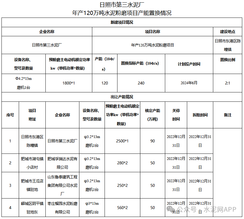 2022年8月8日公告的日照市第三水泥廠年產(chǎn)120萬噸水泥粉磨項目,日照市第三水泥廠決定不再實施,現(xiàn)予以公告。原產(chǎn)能置換情況如下: