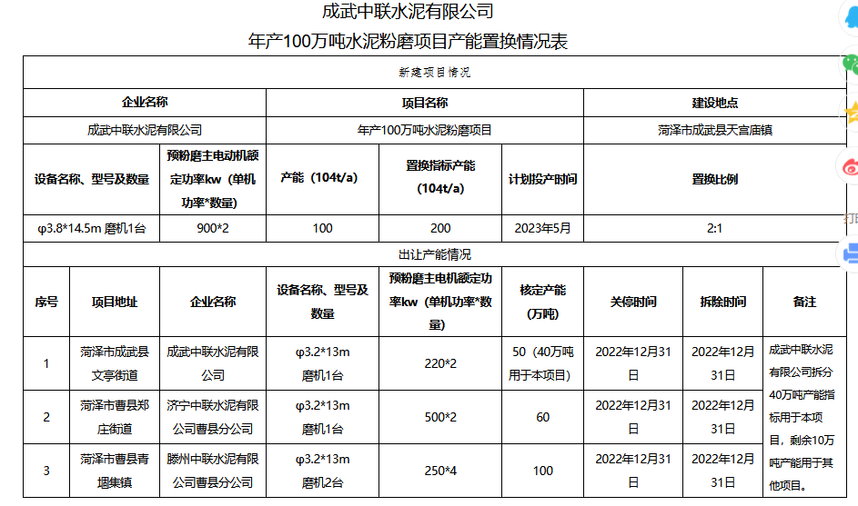 2022年10月19日公告的成武中聯(lián)水泥年產(chǎn)100萬噸產(chǎn)線產(chǎn)能置換項目,中聯(lián)集團決定不再實施。中聯(lián)集團擬將該方案中滕州中聯(lián)曹縣分公司100萬噸產(chǎn)能指標(biāo),調(diào)配用于魯南中聯(lián)新建年產(chǎn)130萬噸水泥粉磨項目。